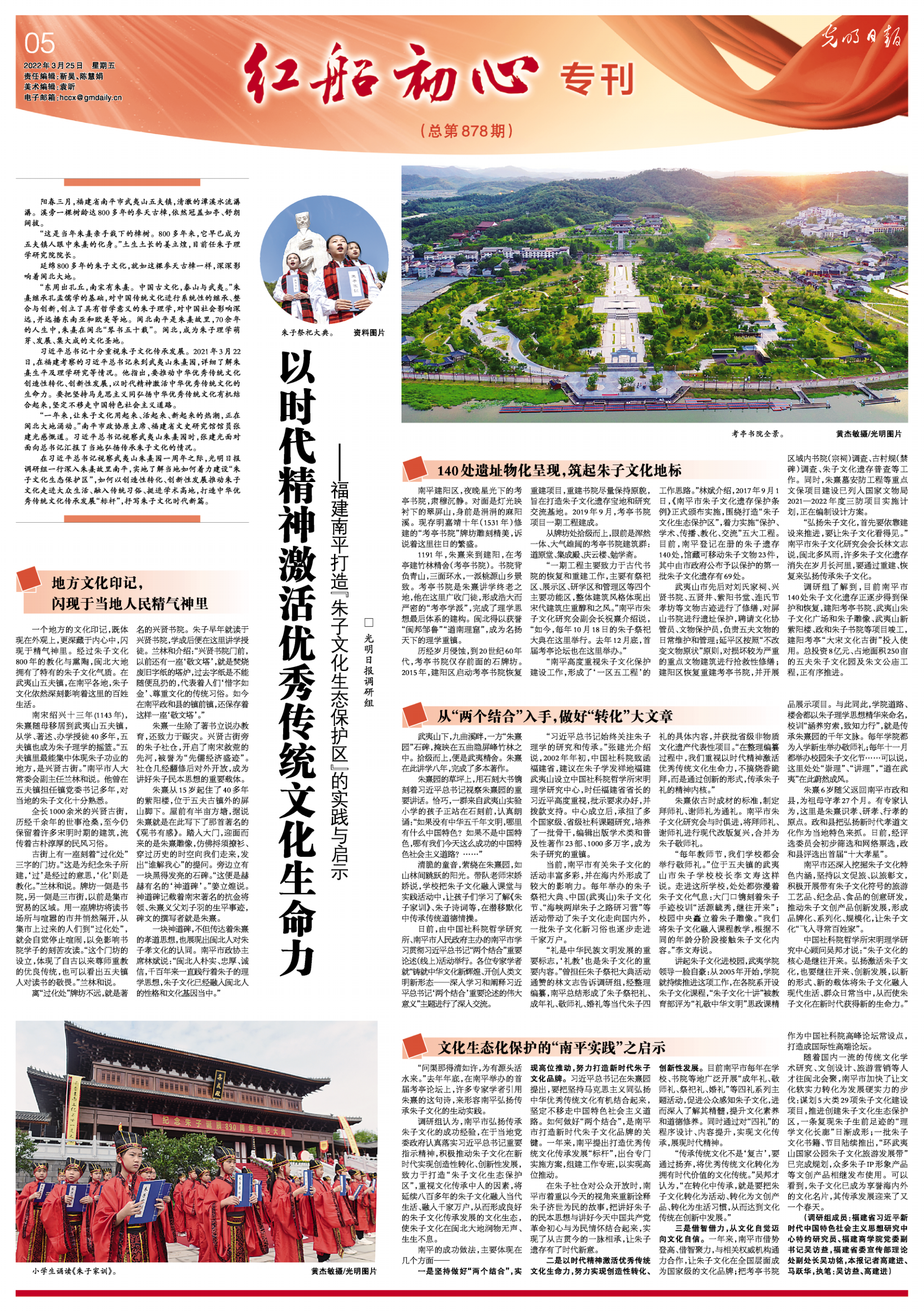 小学生诵读《朱子家训》。黄杰敏摄/光明图片 阳春三月,福建省南平市武夷山五夫镇,清澈的潭溪水流潺潺。溪旁一棵树龄达800多年的参天古樟,依然冠盖如亭、舒朗阔拔。 “这是当年朱熹亲手栽下的樟树。800多年来,它早已成为五夫镇人眼中朱熹的化身。”土生土长的姜立煌,目前任朱子理学研究院院长。 延绵800多年的朱子文化,就如这棵参天古樟一样,深深影响着闽北大地。 “东周出孔丘,南宋有朱熹。中国古文化,泰山与武夷。”朱熹继承孔孟儒学的基础,对中国传统文化进行系统性的继承、整合与创新,创立了具有哲学意义的朱子理学,对中国社会影响深远,并远播东南亚和欧美等地。闽北南平是朱熹故里,70余年的人生中,朱熹在闽北“琴书五十载”。闽北,成为朱子理学萌芽、发展、集大成的文化圣地。 习近平总书记十分重视朱子文化传承发展。2021年3月22日,在福建考察的习近平总书记来到武夷山朱熹园,详细了解朱熹生平及理学研究等情况。他指出,要推动中华优秀传统文化创造性转化、创新性发展,以时代精神激活中华优秀传统文化的生命力。要把坚持马克思主义同弘扬中华优秀传统文化有机结合起来,坚定不移走中国特色社会主义道路。 “一年来,让朱子文化用起来、活起来、新起来的热潮,正在闽北大地涌动。”南平市政协原主席、福建省文史研究馆馆员张建光感慨道。习近平总书记视察武夷山朱熹园时,张建光面对面向总书记汇报了当地弘扬传承朱子文化的情况。 在习近平总书记视察武夷山朱熹园一周年之际,光明日报调研组一行深入朱熹故里南平,实地了解当地如何着力建设“朱子文化生态保护区”,如何以创造性转化、创新性发展推动朱子文化走进大众生活、融入传统习俗、挺进学术高地,打造中华优秀传统文化传承发展“标杆”,抒写朱子文化时代新篇。 地方文化印记,闪现于当地人民精气神里 一个地方的文化印记,既体现在外观上,更深藏于内心中,闪现于精气神里。经过朱子文化800年的教化与熏陶,闽北大地拥有了特有的朱子文化气质。在武夷山五夫镇,在南平各地,朱子文化依然深刻影响着这里的百姓生活。 南宋绍兴十三年(1143年),朱熹随母移居到武夷山五夫镇,从学、著述、办学授徒40多年,五夫镇也成为朱子理学的摇篮。“五夫镇里最能集中体现朱子功业的地方,是兴贤古街。”南平市人大常委会副主任兰林和说。他曾在五夫镇担任镇党委书记多年,对当地的朱子文化十分熟悉。 全长1000余米的兴贤古街,历经千余年的世事沧桑,至今仍保留着许多宋明时期的建筑,流传着古朴淳厚的民风习俗。 古街上有一座刻着“过化处”三字的门坊。“这是为纪念朱子所建,‘过’是经过的意思,‘化’则是教化。”兰林和说。牌坊一侧是书院,另一侧是三市街,以前是集市贸易的区域。用一座牌坊将读书场所与喧嚣的市井悄然隔开,从集市上过来的人们到“过化处”,就会自觉停止喧闹,以免影响书院学子的刻苦攻读。“这个门坊的设立,体现了自古以来尊师重教的优良传统,也可以看出五夫镇人对读书的敬畏。”兰林和说。 离“过化处”牌坊不远,就是著名的兴贤书院。朱子早年就读于兴贤书院,学成后便在这里讲学授徒。兰林和介绍:“兴贤书院门前,以前还有一座‘敬文塔’,就是焚烧废旧字纸的塔炉,过去字纸是不能随便乱扔的,代表着人们‘惜字如金’、尊重文化的传统习俗。如今在南平政和县的镇前镇,还保存着这样一座‘敬文塔’。” 朱熹一生除了著书立说办教育,还致力于赈灾。兴贤古街旁的朱子社仓,开启了南宋救荒的先河,被誉为“先儒经济盛迹”。社仓几经翻修后对外开放,成为讲好朱子民本思想的重要载体。 朱熹从15岁起住了40多年的紫阳楼,位于五夫古镇外的屏山脚下。屋前有半亩方塘,据说朱熹就是在此写下了那首著名的《观书有感》。踏入大门,迎面而来的是朱熹雕像,仿佛捋须撩衫、穿过历史的时空向我们走来,发出“谁解我心”的提问。旁边立有一块黑得发亮的石碑。“这便是赫赫有名的‘神道碑’。”姜立煌说。神道碑记载着南宋著名的抗金将领、朱熹义父刘子羽的生平事迹,碑文的撰写者就是朱熹。 一块神道碑,不但传达着朱熹的孝道思想,也展现出闽北人对朱子孝文化的认同。南平市政协主席林斌说:“闽北人朴实、忠厚、诚信,千百年来一直践行着朱子的理学思想,朱子文化已经融入闽北人的性格和文化基因当中。” 140处遗址物化呈现,筑起朱子文化地标 南平建阳区,夜晚星光下的考亭书院,肃穆沉静。对面是灯光映衬下的翠屏山,身前是涓涓的麻阳溪。现存明嘉靖十年(1531年)修建的“考亭书院”牌坊雕刻精美,诉说着这里往日的繁盛。 1191年,朱熹来到建阳,在考亭建竹林精舍(考亭书院)。书院背负青山,三面环水,一派桃源山乡景致。考亭书院是朱熹讲学终老之地,他在这里广收门徒,形成浩大而严密的“考亭学派”,完成了理学思想最后体系的建构。闽北得以获誉“闽邦邹鲁”“道南理窟”,成为名扬天下的理学重镇。 历经岁月侵蚀,到20世纪60年代,考亭书院仅存前面的石牌坊。2015年,建阳区启动考亭书院恢复重建项目,重建书院尽量保持原貌,旨在打造朱子文化遗存宝地和研究交流基地。2019年9月,考亭书院项目一期工程建成。 从牌坊处拾级而上,眼前是浑然一体、大气雄阔的考亭书院建筑群: