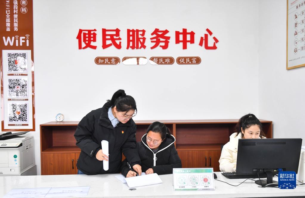 在山西省汾西县僧念镇段村,村党支部书记李佳莉(中)在村委会处理事务(1月27日摄)。