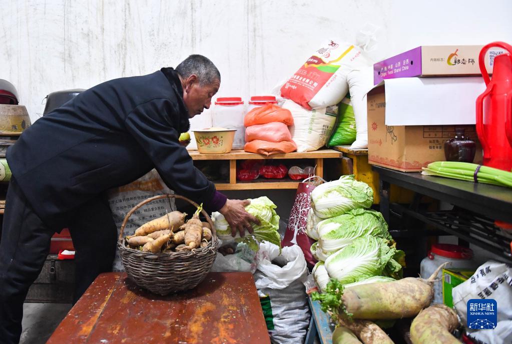 在山西省汾西县僧念镇段村,脱贫户蔡文明在家中整理蔬菜(1月26日摄)。
