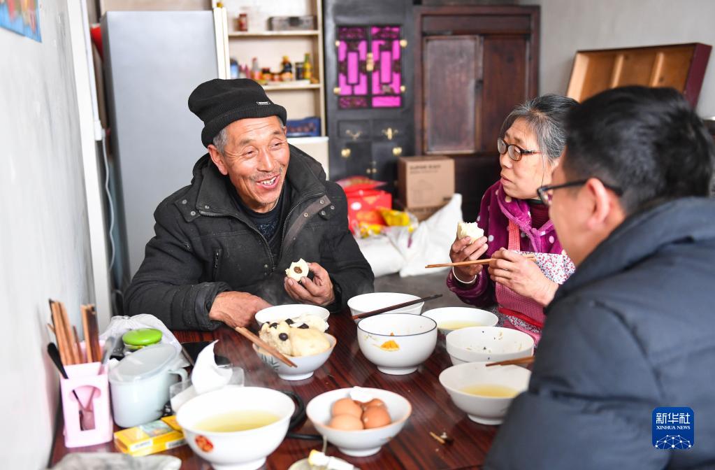 在山西省汾西县僧念镇段村,脱贫户蔡文明(左)和家人吃早饭(1月27日摄)。
