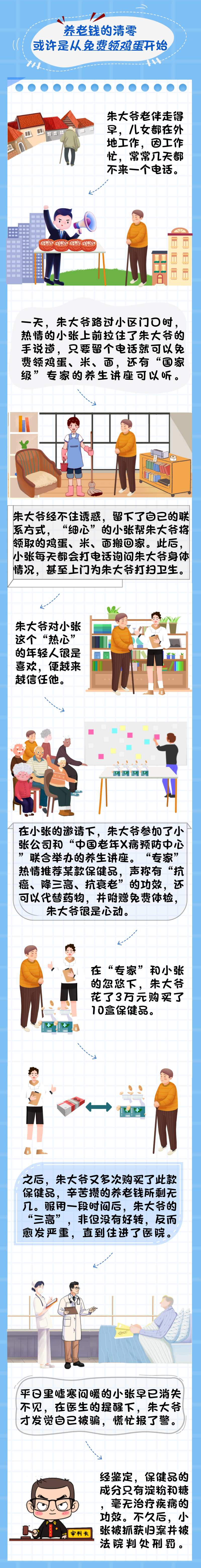 牢记不可贪图小利 天上不会掉馅饼 对象 一般选在菜市场、集贸市场附近以及公园晨练的老年人。 套路 谎称受医院委托,正在开展针对老年疾病普查的活动,活动由“国家级”医疗机构联合主办等。 手法 组织老年人听养生讲座,聘请冒牌专家为老年人授课,进行免费体检,从而有针对性地夸大推销产品功效,诱骗老年人花高价购买。同时,诈骗分子还会与老年人攀谈,对他们嘘寒问暖,逐步了解他们的家庭人员组成、家庭收入等,进一步稳定“客户”。 宣传策略 常常夸大产品功效,含有“绝对化”用语和不实承诺,声称可以治疗某种疾病或多种疾病,使用“彻底根治”“药到病除”等用语,甚至以“无效退款”“保险公司保险”“无毒副作用”等承诺,欺骗、诱导老年人。抓住老年人“恨病”的心理,老人想听什么诈骗分子就说什么。 面对类似的骗术,老年朋友们一定要保持头脑清醒,不贪小利,不轻信他人,天上不会掉馅饼!应从正规渠道获取科学的保健知识,到正规的医疗机构就医、购买药品,不相信所谓的“特效药”“神医”,保管好自己的身份证、银行卡等个人信息。此外,作为儿女也应常常回家看看,关心老年人的生活状况、日常动向,多陪伴父母,提供精神上的慰藉,不给骗子趁虚而入的空间。 大家还可以 长按识别二维码 举报养老诈骗 ↓↓↓ ![]() |