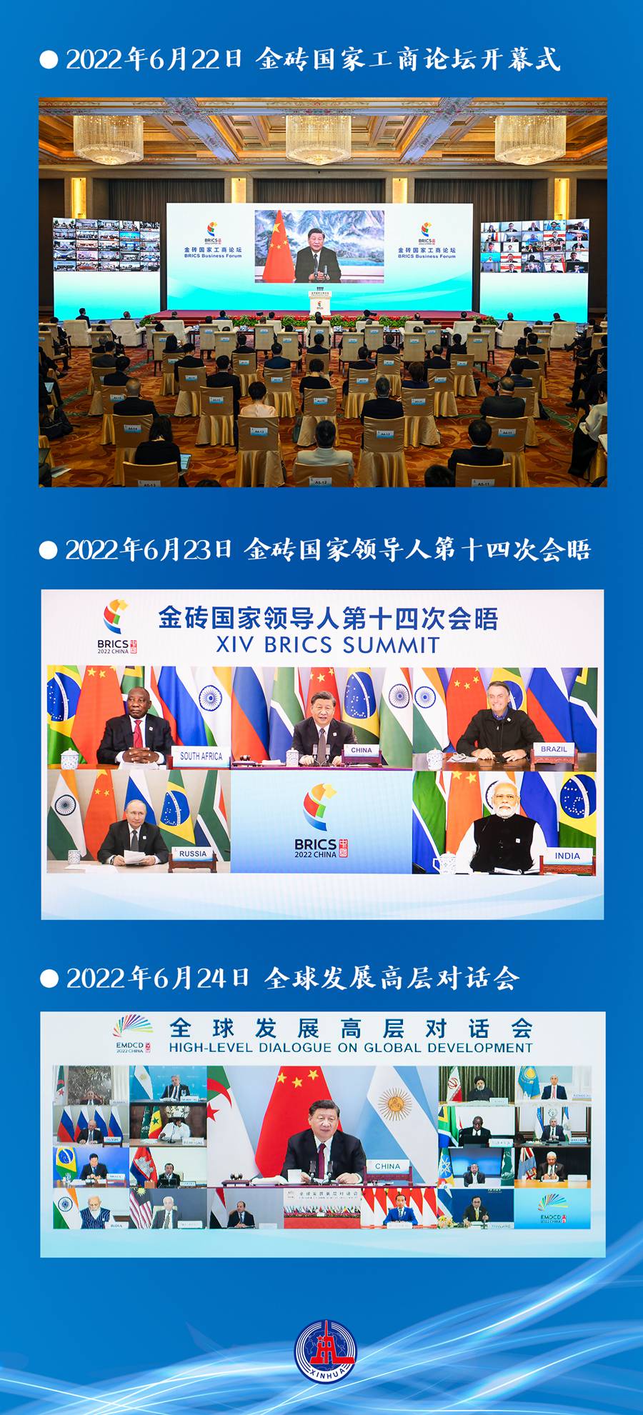 6月22日至24日,金砖“中国年”的高光时段,连续三个晚上,习近平主席以视频方式相继出席金砖国家工商论坛开幕式,主持金砖国家领导人第十四次会晤、全球发展高层对话会。