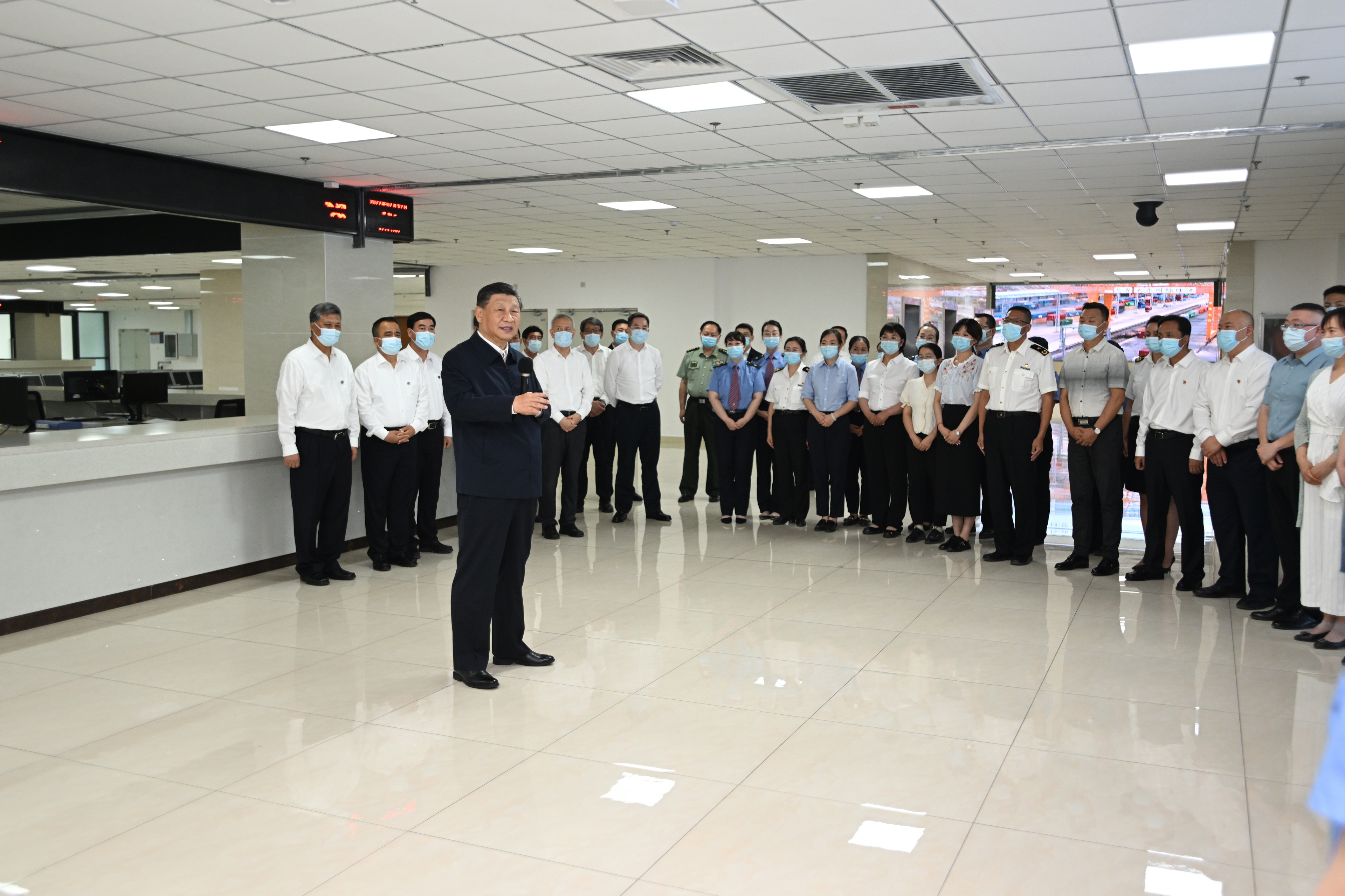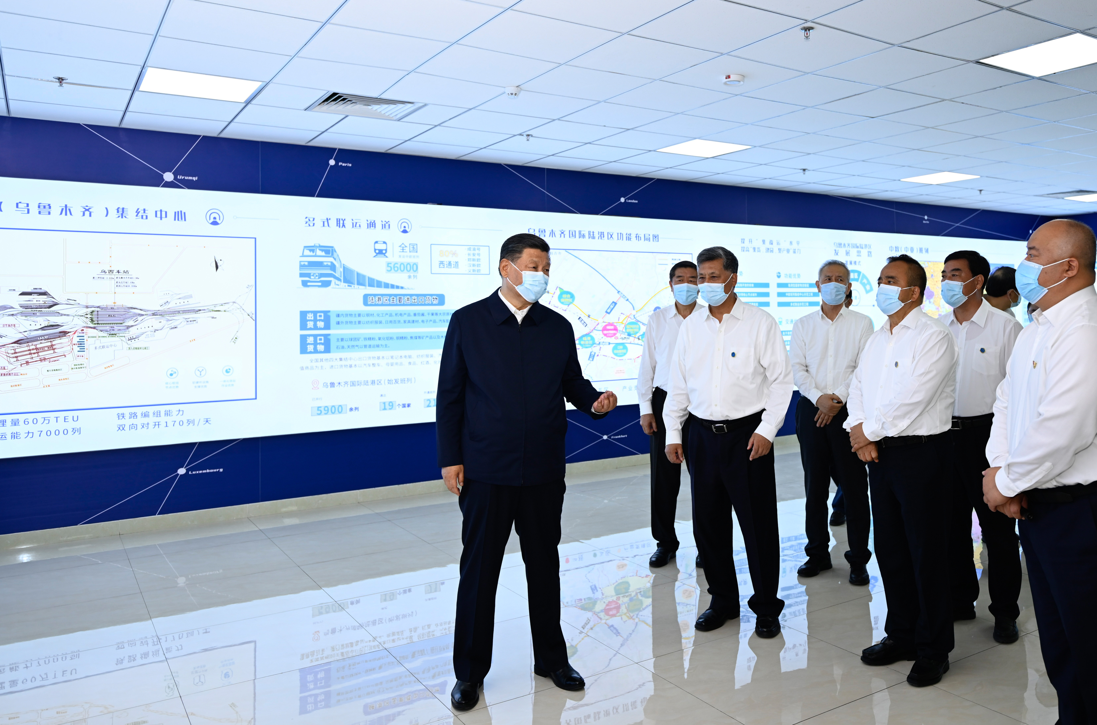 一声声汽笛嘹亮悠扬,一辆辆集装箱半挂车有序驶入,盛夏的乌鲁木齐国际陆港区,一派繁忙景象。 7月12日下午,习近平总书记来到乌鲁木齐国际陆港区,听取整体情况介绍,通过实时画面察看中欧班列(乌鲁木齐)集结中心各功能区和阿拉山口口岸、霍尔果斯口岸现场作业情况,并同工作人员及现场办事人员亲切交流。