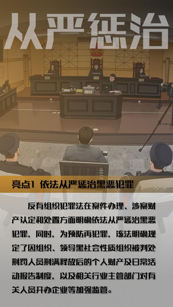 3“软暴力” “软暴力”:为了谋取非法利益或者非法影响,有组织地进行滋扰、纠缠、哄闹、聚众造势等,对他人形成心理强制,足以限制人身自由、危及人身财产安全,影响正常社会秩序、经济秩序的手段。 境外黑社会组织的法律适用 境外的黑社会组织到中华人民共和国境内发展组织成员、实施犯罪,以及在境外对中华人民共和国国家或者公民犯罪的,适用本法。 反有组织犯罪法的意义 “制定反有组织犯罪法是总结扫黑除恶专项斗争经验,加强制度建设,保障在法治轨道上常态化、机制化开展扫黑除恶工作的重要举措。”反有组织犯罪法的出台,对于建设更高水平的平安中国、法治中国,不断增强人民群众的获得感、幸福感、安全感,确保人民安居乐业、社会安定有序、国家长治久安,具有重大意义。 六大亮点 亮点一 依法从严惩治黑恶犯罪 依法从严惩治黑恶犯罪是该法的一大亮点。