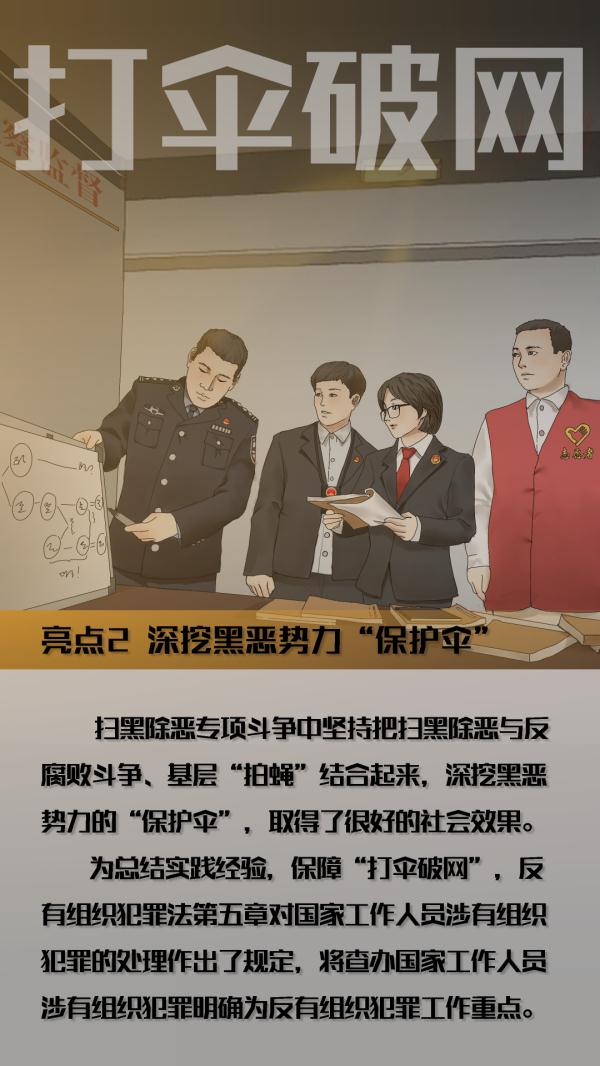 在案件办理方面,反有组织犯罪法明确对于有组织犯罪的组织者、领导者和骨干成员应当严格掌握取保候审、不起诉、缓刑等的适用条件,充分适用剥夺政治权利、没收财产、罚金等刑罚;规定公安机关在线索核查阶段,对黑社会性质组织案件的涉案财产可以依法采取紧急止付、临时冻结、临时扣押的紧急措施;对有组织犯罪案件的犯罪嫌疑人、被告人可以采取异地羁押、分别羁押或者单独羁押等措施;对特定有组织犯罪罪犯异地执行刑罚、严格减刑假释。 对于涉案财产认定和处置方面,反有组织犯罪法规定,办案机关可以全面调查涉嫌有组织犯罪的组织及其成员的财产状况;被告人实施黑社会性质组织犯罪的定罪量刑事实已经查清,有证据证明其在犯罪期间获得的财产高度可能属于黑社会性质组织犯罪的违法所得及其孳息、收益,并且被告人不能说明财产合法来源的,应当依法予以追缴、没收。 在预防再犯罪方面,法律规定了因组织、领导黑社会性质组织被判处刑罚人员刑满释放后的个人财产及日常活动报告制度,以及相关行业主管部门对有关人员开办企业等加强监管。 亮点二 深挖黑恶势力“保护伞” 扫黑除恶专项斗争中坚持把扫黑除恶与反腐败斗争、基层“拍蝇”结合起来,深挖黑恶势力的“保护伞”,取得了很好的社会效果。 为总结实践经验,保障“打伞破网”,反有组织犯罪法第五章对国家工作人员涉有组织犯罪的处理作出了规定,将查办国家工作人员涉有组织犯罪明确为反有组织犯罪工作重点。