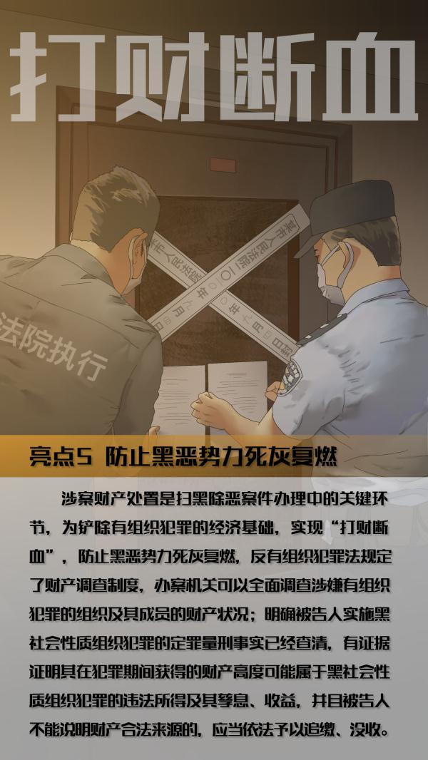 01“预防有组织犯罪工作需要有关部门和社会力量的共同参与。” 02反有组织犯罪法对各级人民政府及有关部门、村(居)民委员会、企业事业单位、社会组织等各方面的职责作了规定,并对保护未成年人合法权益,防止未成年人遭受有组织犯罪侵害作了专门规定。 03此外,为加强对涉未成年人的有组织犯罪的惩治,反有组织犯罪法规定,发展未成年人参加黑社会性质组织、境外的黑社会组织,教唆、诱骗未成年人实施有组织犯罪,或者实施有组织犯罪侵害未成年人合法权益的,依法从重追究刑事责任;教唆、诱骗未成年人参加有组织犯罪组织或者阻止未成年人退出有组织犯罪组织,尚不构成犯罪的,依法从重处罚。 亮点五 防止黑恶势力死灰复燃 涉案财产处置是扫黑除恶案件办理中的关键环节,为铲除有组织犯罪的经济基础,实现“打财断血”,防止黑恶势力死灰复燃,反有组织犯罪法作了一些新的规定。