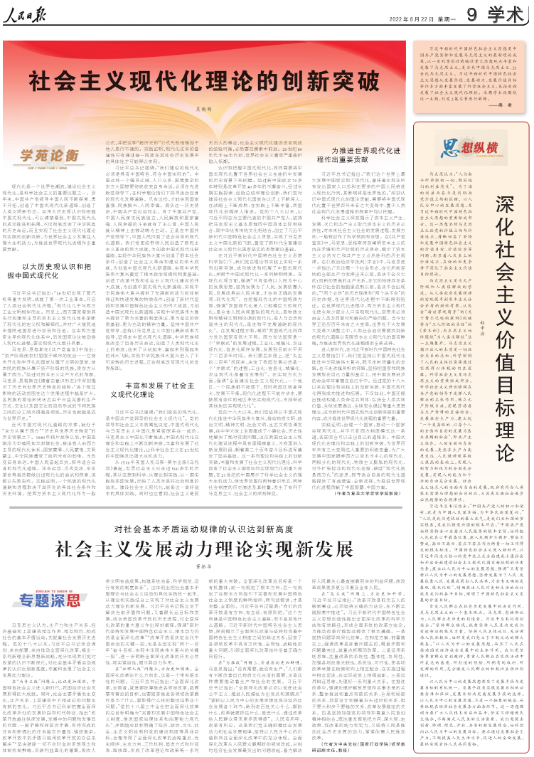 习近平新时代中国特色社会主义思想是中国共产党坚持和发展马克思主义的最新理论成果,以一系列原创性战略性重大思想观点丰富和发展了马克思主义,是当代中国马克思主义、21世纪马克思主义。习近平新时代中国特色社会主义思想从发展阶段、发展动力、发展价值目标等许多方面丰富发展了科学社会主义,包括创新发展了社会主义现代化理论。本期学术版围绕这一主题,刊发3篇文章进行阐释。——编 者 现代化是一个世界性潮流,建设社会主义现代化,是科学社会主义的重要议题之一。百年来,中国共产党领导中国人民不断探索、勇于开拓,创造了中国式现代化新道路,创造了人类文明新形态。运用大历史观认识和把握中国式现代化,可以清楚看到,中国式现代化的成功推进和拓展,不仅彻底改变了中华民族的历史命运,而且实现了社会主义现代化理论和实践的创新突破,为世界社会主义发展注入强大生机活力,为推进世界现代化进程作出重要贡献。习近平总书记指出:“18世纪出现了蒸汽机等重大发明,成就了第一次工业革命,开启了人类社会现代化历程。”现代化几乎与西方工业文明相伴而生。历史上,西方国家借助其先行构建和主导的资本主义现代化体系垄断了现代化的定义权和解释权,并对广大殖民地半殖民地国家进行奴役和压迫。在由西方国家主导的现代化体系中,后发国家往往被动卷入现代化进程,要实现现代化绝非易事。马克思、恩格斯在《共产党宣言》中指出:“资产阶级使农村屈服于城市的统治……它使未开化和半开化的国家从属于文明的国家,使农民的民族从属于资产阶级的民族,使东方从属于西方。”经过对资本主义生产方式的考察,马克思、恩格斯在《德意志意识形态》中深刻揭示了历史向世界历史转变的趋势:“各个相互影响的活动范围在这个发展进程中越是扩大,各民族的原始封闭状态由于日益完善的生产方式、交往以及因交往而自然形成的不同民族之间的分工消灭得越是彻底,历史也就越是成为世界历史。”近代中国对现代化道路的求索,就处于“东方从属于西方”“历史向世界历史转变”的历史背景之下。1840年鸦片战争以后,中国逐渐沦为半殖民地半封建社会,被迫卷入由西方主导的现代化体系,国家蒙辱、人民蒙难、文明蒙尘,中华民族遭受了前所未有的劫难。为改变自身命运,中国人民奋起反抗,探寻适合自身的现代化道路。洋务运动、戊戌变法、辛亥革命等虽然都做出过现代化的尝试和探索,但都以失败告终。实践证明,一个民族的现代化道路和进程取决于其所处的具体社会条件和历史环境。把西方资本主义现代化作为一般公式,并把这种“超历史的”公式先验地强加于他人是行不通的。实践证明,现代化任务的普遍性只有通过每一民族在其社会历史发展中的具体性才可能得以实现。习近平总书记强调:“我们建设的现代化必须是具有中国特色、符合中国实际的”。中国这样一个幅员辽阔、人口众多、国情复杂的东方大国想要彻底改变自身命运,必须在先进政党领导下,在科学理论指引下探寻适合自身的现代化发展道路。只有这样,才能实现国家富强、民族振兴、人民幸福。肩负这一历史使命,中国共产党应运而生。有了中国共产党,中国人民谋求民族独立、人民解放和国家富强、人民幸福的斗争就有了主心骨,中国人民就从精神上由被动转为主动。正是在中国共产党领导下,中国人民找到了适合自身的现代化道路。我们党团结带领人民创造了新民主主义革命的伟大成就,为创造中国式现代化新道路、实现中华民族伟大复兴创造了根本社会条件;创造了社会主义革命和建设的伟大成就,为创造中国式现代化新道路、实现中华民族伟大复兴奠定了根本政治前提和制度基础;创造了改革开放和社会主义现代化建设的伟大成就,为创造中国式现代化新道路、实现中华民族伟大复兴提供了充满新的活力的体制保证和快速发展的物质条件;创造了新时代坚持和发展中国特色社会主义的伟大成就,为创造中国式现代化新道路、实现中华民族伟大复兴提供了更为完善的制度保证、更为坚实的物质基础、更为主动的精神力量。坚持中国共产党领导,坚持以马克思主义中国化最新成果为指导,坚持走中国式现代化道路,中华民族彻底改变了自身历史命运,创造了人类现代化史上的奇迹,迎来了从站起来、富起来到强起来的伟大飞跃,实现中华民族伟大复兴进入了不可逆转的历史进程,正在彻底改写现代化的世界版图。习近平总书记强调:“我们推进的现代化,是中国共产党领导的社会主义现代化”。党的领导和社会主义本质属性决定,中国式现代化与马克思主义中国化是紧密联系在一起的。马克思主义中国化不断推进,中国式现代化在理论和实践上不断创新突破,丰富和发展了社会主义现代化理论,让科学社会主义在21世纪的中国焕发出强大生机活力。从1516年英国人托马斯·莫尔出版《乌托邦》算起,世界社会主义已走过500多年的历程,其从空想到科学、从理论到实践、从一国实践到多国发展,反映了人类对美好社会制度的追求。建设社会主义现代化,就是这一美好追求的具体实践。同时也应看到,社会主义是前无古人的事业,社会主义现代化建设没有现成的经验可循,必然要在摸索中前进。20世纪80年代末90年代初,世界社会主义遭受