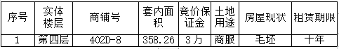 兹定于2022年9月15日上午9时整在屏南县古峰镇长汾社区梨园路1号中心城市广场2幢14层天宇城投公司会议室举行商场部分租赁权竞标会。竞标标的位于屏南县梨园路1号中心城市广场(一期)永辉超市楼上,第四层商场局部面积租赁权,具体如下: 一、标的物 注:(1)、对上述标的物进行竞价。 (2)、上述竞价标的的层高、结构、设施设备及房源状况等均以现状为准。 二、竞买人资格:为合法存续的企业法人或自然人。 三、主要经营的行业或用途:商业及培训用途使用。 四、报名时间:2022年9月5日--- 2022年9月14日 五、有意竞买者请与我司联系看样、了解详情。缴纳竞买保证金、办理竞买登记手续时间截至2022年9月14日下午18:00时。 六、报名地点:屏南县古峰镇梨园路1号中心城市广场6幢201D天宇城投公司销售中心 七、联系电话:0593-7118555(上午8:00-12:00下午15:00-18:00)