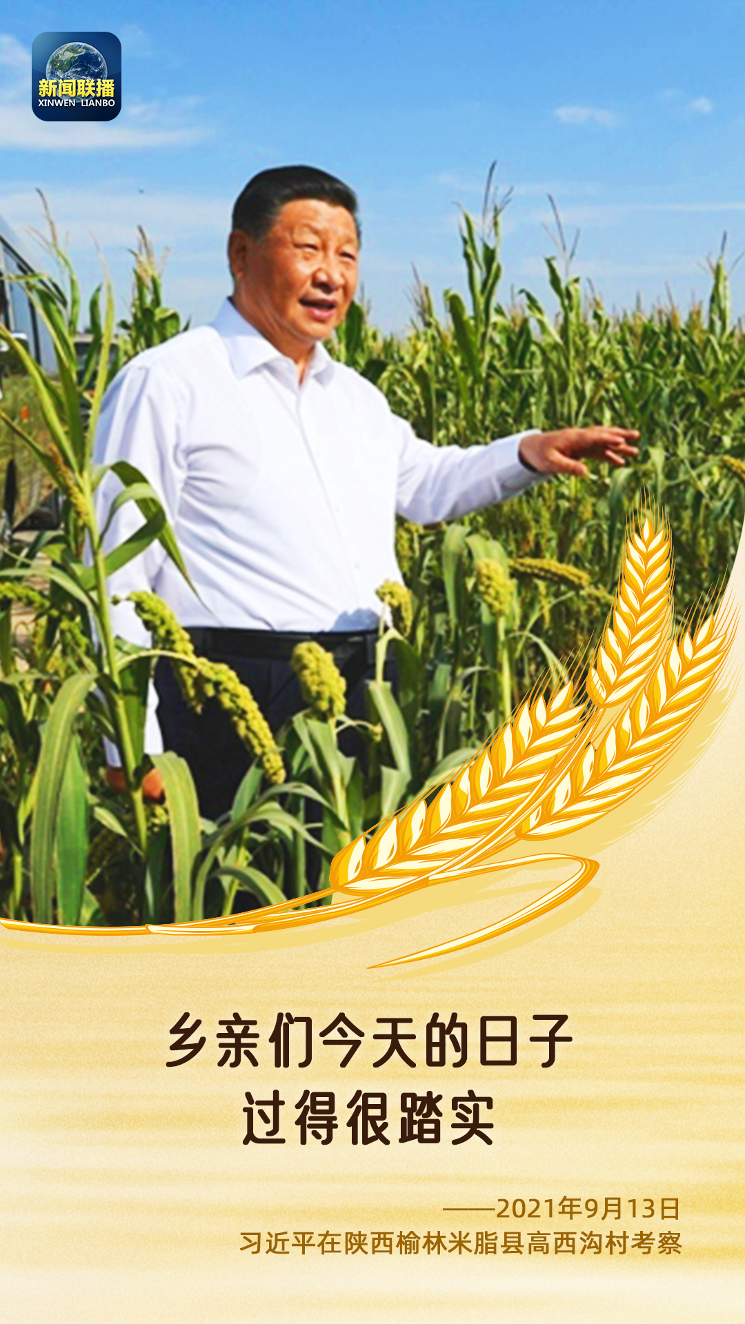 “乡亲们今天的日子过得很踏实。” 这是2021年9月,习近平总书记在陕西榆林考察时,与当地农民拉家常时说的话。 农,天下之大业也。我国是农业大国,重农固本是安民之基、治国之要。习近平总书记在各地考察时常常走进田间地头看收成,与老乡们拉家常。 今天是中国农民丰收节,一起来看总书记对农民生活的惦记和牵挂、对农业农村发展的关注和要求。 “乡亲们今天的日子过得很踏实” “家里都种的什么?忙不忙得过来?” “忙得过来,老两口一起干。” “地里有没有套种豆子?” “今年没有套种。” 这是2021年9月,习近平总书记在陕西省榆林市米脂县银州街道高西沟村考察调研时,走进田间,与村民高治周的对话。 总书记察看谷子、糜子、玉米长势,同正在田里干活的乡亲们拉起家常。 听到乡亲说“日子好了,现在白面、大米、肉都可以吃”,总书记笑着说:“现在不是说稀罕吃白面和猪肉了,反而有时候吃五谷杂粮吃得还挺好。” “沧桑之变啊,乡亲们今天的日子过得很踏实。”总书记感慨地说。