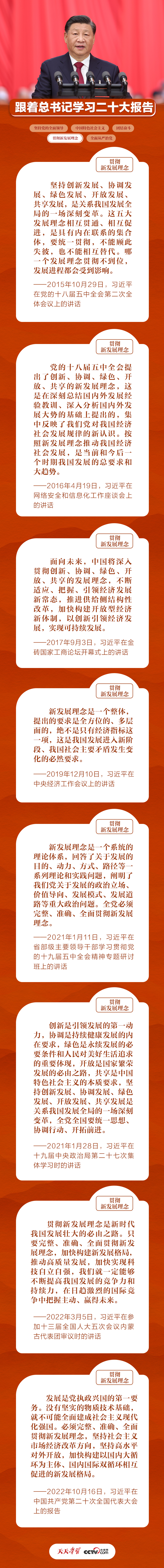 编者按:党的二十大报告强调,全党必须牢记,坚持党的全面领导是坚持和发展中国特色社会主义的必由之路,中国特色社会主义是实现中华民族伟大复兴的必由之路,团结奋斗是中国人民创造历史伟业的必由之路,贯彻新发展理念是新时代我国发展壮大的必由之路,全面从严治党是党永葆生机活力、走好新的赶考之路的必由之路。 这“五个必由之路”是我们党在长期实践中得出的至关紧要的规律性认识,必须倍加珍惜、始终坚持。央视网《天天学习》专栏特推出《跟着总书记学习二十大报告》“五个必由之路”系列,与您一起从总书记讲话中理解这“五个必由之路”的深刻内涵。 |天天学习|理念是行动的先导。党的十八大以来,以习近平同志为核心的党中央把握时代大势,提出并深入贯彻创新、协调、绿色、开放、共享的新发展理念,引领中国在破解发展难题中增强动力,不断朝着更高质量、更有效率、更加公平、更可持续的方向前进。 央视网《天天学习》梳理总书记重要论述,与您一同深入理解“贯彻新发展理念是新时代我国发展壮大的必由之路”的内涵要义。