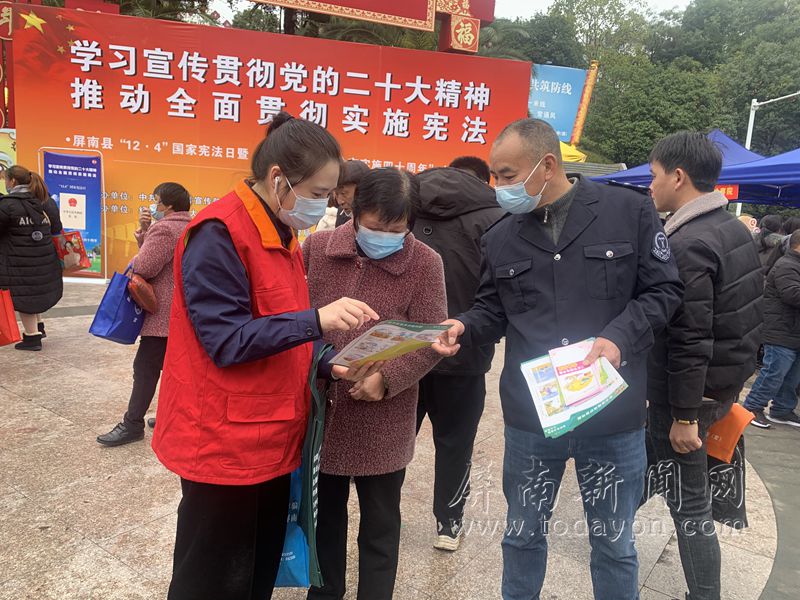 今日屏南消息(甘叶斌 郑陈丹)12月8日,屏南县在街心广场隆重举行以“学习宣传贯彻党的二十大精神 推动全面贯彻实施宪法”为主题的2022年“宪法宣传周”活动启动仪式。县委常委、宣传部部长韦孝珠出席仪式。 韦孝珠指出,今年是实施第八个五年普法规划的第二年,面对新的形势、新的任务,强化普法教育,营造良好的法治环境尤为重要。各乡镇各有关部门要坚持以习近平新时代中国特色社会主义思想为指导,深入学习贯彻习近平法治思想和习近平总书记关于宪法的重要论述,全面落实“八五”普法规划,牢牢把握宪法学习宣传教育的正确政治方向和舆论导向,突出学习宣传党的二十大精神,积极开展一系列形式多样、内容丰富又贴近群众的法治宣传教育活动,使宪法精神深入人心、以宪法精神凝心聚力,切实把宪法学习宣传教育融入到执法、司法实践中去,做到宪法进乡村、进企业、进机关、进学校、进社区、进军营、进网络,在全县营造尊法、学法、守法和用法的良好氛围,使遵守宪法成为全县人民的自觉行动。 活动现场,工作人员通过悬挂横幅、摆放宣传展板、现场讲解、发放宣传品等多种方式开展普法宣传,向来往群众发放诉讼指南、宪法宣传册等材料,共发放相关知识宣传资料5000余份,解答群众法律咨询100余人次。 |