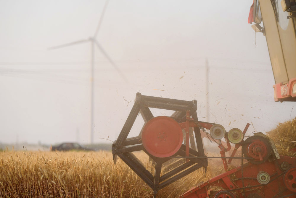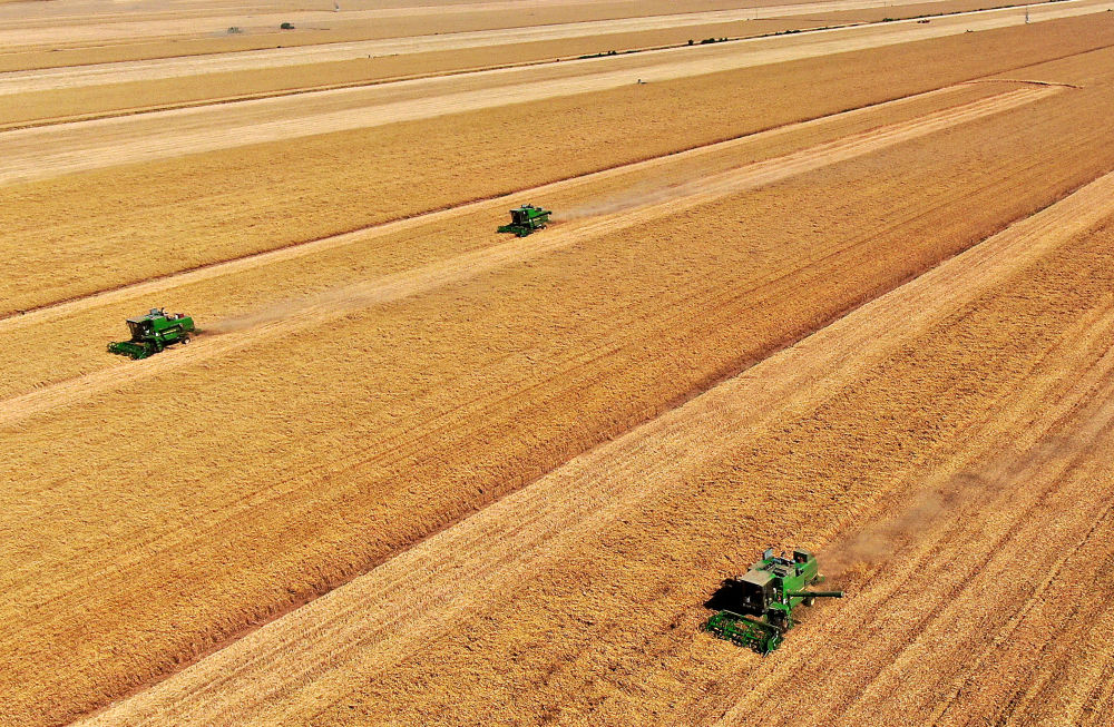 在河南省黄泛区农场九分场的麦田里,农机手操作收割机收获小麦(2021年6月6日摄,无人机照片)。 新华社记者 李安 摄 粮食产能夯得更实。我国严守18亿亩耕地红线,到今年底将累计建成10亿亩旱涝保收、高产稳产的高标准农田,启动实施国家黑土地保护工程,种业振兴行动开局良好。农作物自主培育品种面积占比95%以上,实现中国粮主要用中国种。