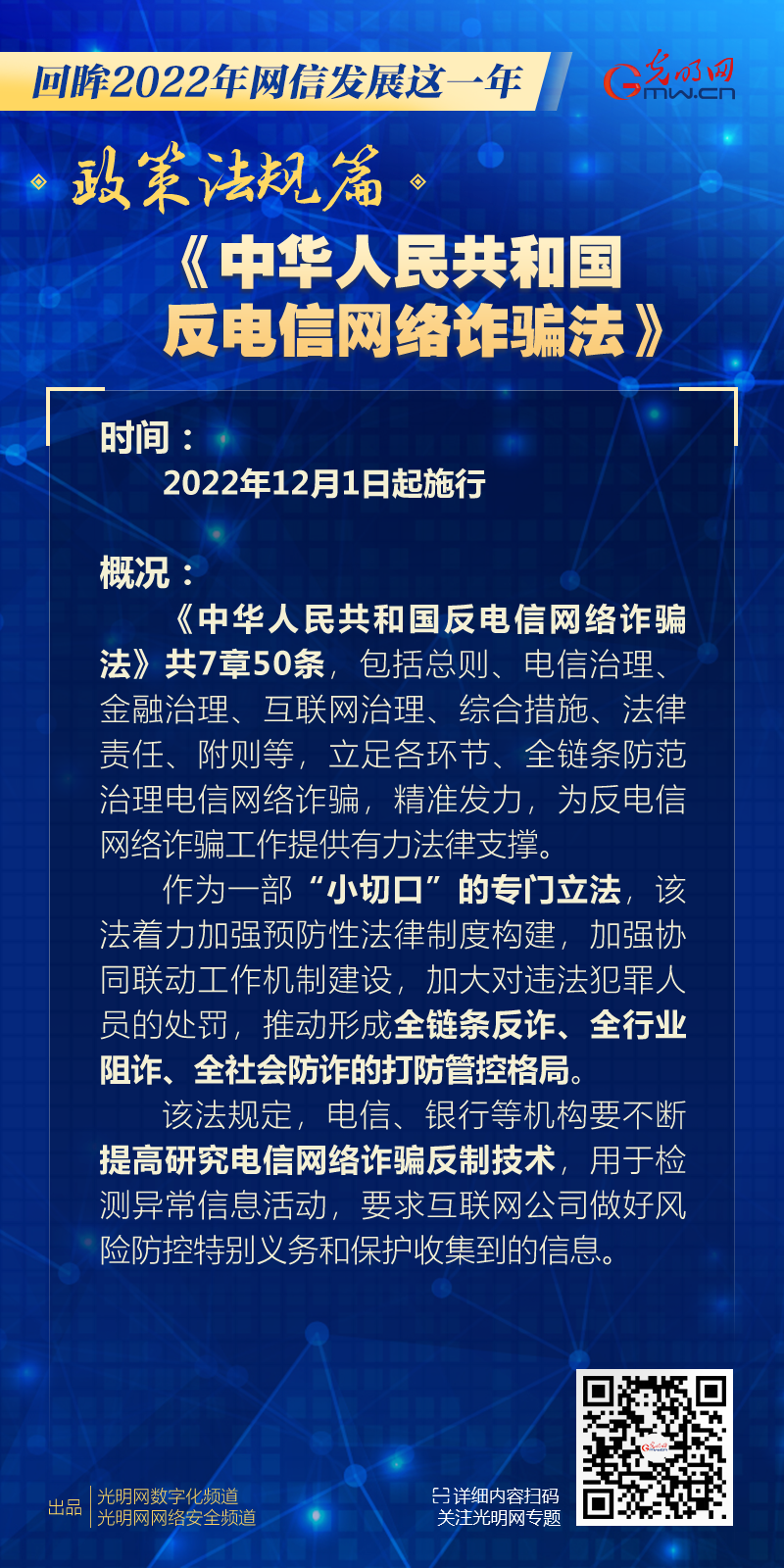 《中华人民共和国反电信网络诈骗法》自2022年12月1日起施行。 该法共7章50条,包括总则、电信治理、金融治理、互联网治理、综合措施、法律责任、附则等,坚持以人民为中心,统筹发展和安全,立足各环节、全链条防范治理电信网络诈骗,精准发力,为反电信网络诈骗工作提供有力法律支撑。 作为一部“小切口”的专门立法,该法在总结反诈工作经验基础上,着力加强预防性法律制度构建,加强协同联动工作机制建设,加大对违法犯罪人员的处罚,推动形成全链条反诈、全行业阻诈、全社会防诈的打防管控格局。 该法规定,电信、银行等机构必须不断提高研究电信网络诈骗反制技术,用于检测异常信息活动,同时要求互联网公司做好风险防控特别义务和保护收集到的信息。