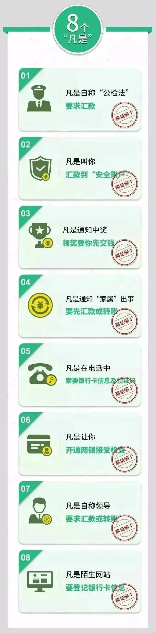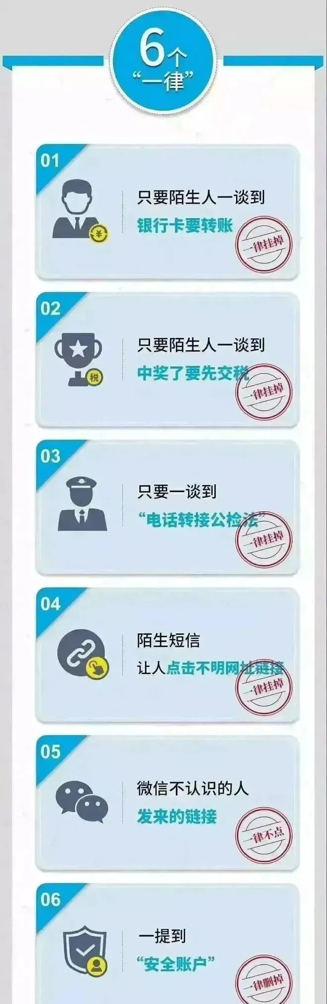 《中华人民共和国反电信网络诈骗法》由中华人民共和国第十三届全国人民代表大会常务委员会第三十六次会议于2022年9月2日通过,并于2022年12月1日起施行。 反电信网络诈骗法共七章50条,包括总则、电信治理、金融治理、互联网治理、综合措施、法律责任、附则等,坚持以人民为中心,统筹发展和安全,立足各环节、全链条防范治理电信网络诈骗,精准发力,为反电信网络诈骗工作提供有力法律支撑。 一图读懂 《中华人民共和国反电信网络诈骗法》 ![]() 谨防 电信诈骗 不听 不信 不转账 常见的诈骗手段有哪些? ![]() 反诈方法 国家反诈中心APP你下载了吗? 没下载的你快行动起来! 国家反诈中心APP 可以帮助你激活APP诈骗预警 以此减少诈骗来电和短信! ![]() 牢记六个“一律” ![]() 牢记八个“凡是” ![]() |