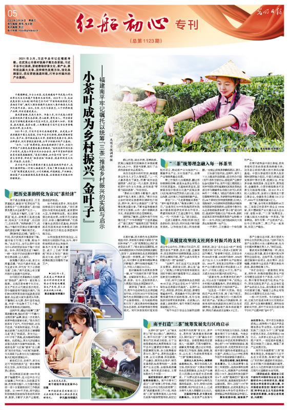 科技特派员刘国英(左)正在传授年轻茶人辨识茶青发酵情况。伊凡摄/光明图片 2021年3月,习近平总书记在福建考察。在武夷山市星村镇燕子窠生态茶园,习近平总书记强调,要统筹做好茶文化、茶产业、茶科技这篇大文章,坚持绿色发展方向,强化品牌意识,优化营销流通环境,打牢乡村振兴的产业基础。 千载儒释道,万古山水茶,这是福建南平市武夷山作为世界文化与自然遗产形象的生动写照。2022年11月,包括武夷岩茶(大红袍)制作技艺在内的“中国传统制茶技艺及其相关习俗”,被列入联合国教科文组织人类非物质文化遗产代表作名录。由此,自然、文化与茶技艺,三个世界级遗产品牌,同时花落武夷山。 春风剪垂柳,乳燕又来归。阳春三月,位于武夷山国家公园内的燕子窠生态茶园,青山披翠,景色宜人。作为国家农业可持续发展试验示范区示范点,这里游人如织。茶园里,春风荡漾,春茶吐蕾,三块镌刻着习近平总书记重要嘱托的石碑,坐立其间。 2021年3月,习近平总书记在福建考察。在武夷山市星村镇燕子窠生态茶园,习近平总书记强调,要统筹做好茶文化、茶产业、茶科技这篇大文章,坚持绿色发展方向,强化品牌意识,优化营销流通环境,打牢乡村振兴的产业基础。 “如今,‘三茶’统筹理念,宛如春雨滋润了茶乡,为我们开辟茶产业绿色高质量发展全新路径。”谈到这两年闽北茶产业变化,武夷山市茶业同业公会会长、南平市首批科技特派员刘国英感触颇深,“茶农们都讲,如今茶叶变‘金叶’,以前大家种茶,种的是‘粗茶淡饭’的粗茶,现在种的是文化茶、科技茶、生态茶。” 在习近平总书记考察燕子窠生态茶园两周年前夕,光明日报调研组一行深入福建南平,实地了解当地致力打造“三茶”统筹发展先行区,以文化赋魂、科技赋能、产业融合,推动茶产业全链条绿色高质量发展,全面推进乡村振兴的经验做法。 把历史茶韵转化为富民“茶经济” 南平是全国著名茶区、万里茶道起点,被誉为“红茶祖地”“乌龙茶故乡”“白茶发源地”,是中国茶类最为齐全的茶产区之一。 “这里是下梅村,它是‘万里茶道’起点,武夷茶正是通过海丝、陆丝及‘万里茶道’,走出国门,走向世界。”和煦的春日下,武夷山下梅村村民邹应文满怀激情地向游客讲解下梅村的历史。 据《崇安县志》载:“康熙十九年间,其时武夷茶市集崇安下梅,盛时每日行筏三百艘,转运不绝。”由此可见,当年以茶叶交易为中心的经贸活动在下梅十分活跃。如今,我们再度走进下梅村,一砖一瓦似乎仍诉说着当年繁荣的交易场景,让人感叹。 纵观整个闽北大地,茶文化厚重远播。“在汉代就有传说,唐代见诸文字,宋代有‘天下之茶建为最’之称。”南平武夷山市文管所原所长赵建平这样说。 如何把历史茶韵转化为富民的“茶经济”,南平市一直在努力探索。北苑贡茶有着千年历史,其主产区在古代建安县吉苑里,即今福建省南平建瓯市境内。“我们的北苑贡茶自唐宋起就是宫廷御茶,但以前大家只是埋头种茶,不懂得打文化牌,茶叶没有知名度,辛苦一年也挣不了几个钱。”茶农李贵和告诉调研组。 这两年来,建瓯市统筹“三茶”高质量发展,提出打造“千年建州·北苑贡茶”品牌,使这一历史悠久的茶种焕发新的生机。“现在我们的茶有了名气,不但价钱好,还供不应求。”李贵和笑着说,不久前,他还获得了北苑贡茶茶王赛矮脚乌龙“茶王”的奖项。茶文化让一片叶子有了灵魂,成为精神传承的载体。在武夷山,茶文化讲述着从求取功名到不负韶华的故事。当地的名茶“大红袍”就有“状元感恩”的历史传说。“大红袍”的故事,今天再现于以茶文化为主题的《印象大红袍》实景演出中。 新世纪之交,在南平,茶文化还与“科技特派员”这一新生事物相互交织,共同在闽北大地奏响茶山新曲。 科技特派员制度1999年发源于福建南平,是习近平总书记在福建工作时深入总结基层实践、科学深化提升、大力倡导推进的一项十分重要的农村工作机制创新。从1999年开始,南平就以科技特派员制度指导茶农科学种茶、制茶,不断扩大茶产业规模、提高经济效益。 如今的闽北茶乡,到处是科技特派员忙碌的身影。“我们茶园如今使用的是绿肥,夏季套种大豆,冬季套种油菜。现在茶树旁边的是油菜,油菜开花后就地回田,补给土壤的磷和钾。”在燕子窠生态茶园示范基地,科技特派员刘国英向前来参观学习的外地茶农们介绍生态茶园的种植方法。 从科技服务到科技创业,从单枪匹马到团队作战,如今,南平科技特派员创业和技术服务已实现乡镇全覆盖,成千上万的“科特派”把论文写在广袤的闽北大地,也把“三茶”统筹的理念传播到千家万户。 “三茶”统筹理念融入每一杯茶里 群山环抱,绿水环流,苍翠欲滴,武夷山福莲茶庄园掩映在诗情画意的山水之中。茶香与美景,吸引了众多的游客前来品茗观光。 来自当地茶乡的何世安,被福莲茶业作为人才引入管理层。“上一代人做茶是为了谋生,所谓‘柴米油盐酱醋茶’;我们这一代人做茶,更多是把茶叶当作文化来做,讲究的是‘琴棋书画诗酒茶’。”何世安说。 “茶的文化属性不断提升,越来越多年轻人喜欢上茶饮。”南平市农业农村局局长徐春晖向调研组介绍说,两年来,南平认真做好“三茶”统筹发展这篇文章,不断丰富和提炼茶历史文化资源,从单一茶叶营销向