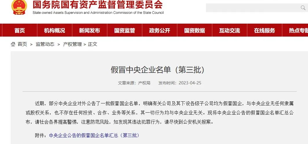 来源:国资委网站 事实上,近两年,国务院国资委对假央企、国企进行集中公示。2021年10月,26家中央企业通过官网、微信公众号等多种渠道对外公告了353户假冒国企名单。通告社会各界,上述公司及其下设各级子公司均为假冒国企,与中央企业无任何隶属或股权关系,也不存在任何投资、合作、业务等关系,其一切行为均与中央企业无关。提醒社会各界提高警惕,注意防范风险。2022年9月,国务院国资委网站发布了第二批假冒中央企业名单,共175家。近期,多家知名央企密集发布声明,称有不法企业假冒集团子公司。4月14日,中钢集团郑重澄清并声明,中钢金烨国际贸易有限公司、中钢有色(北京)科技有限公司等11家公司冒名使用了“中钢”字号,对中钢集团公司品牌造成了严重侵权。4月10日晚,国家能源集团公告称,近期,有不法分子通过伪造相关材料等方式,将企业注册为国家能源集团下属子公司,以国家能源集团下属子公司名义开展业务。经国家能源集团核实,以下公司及其下设各级子公司均为假冒国企,与国家能源集团无任何隶属或股权关系,也不存在任何投资、合作、业务等关系,其一切行为均与国家能源集团无关。请社会各界提高警惕,注意防范风险,如发现其违法犯罪行为,请尽快到公安机关报案。4月9日,国家电投发布声明表示,经核实,国恒基业控股集团有限公司、中自云智慧城市科技集团有限公司、北京丝路国华科技有限公司等3家公司及其设立的系列子公司与国家电投无任何隶属或股权关系,也不存在任何投资、合作、业务等关系,其一切行为与国家电投无关,请社会各界提高警惕,注意防范风险。同日,中国国有企业结构调整基金也发表声明称,国恒基业控股集团有限公司及其下属公司(北京国恒基业企业管理有限公司、山东国恒基业建设发展有限公司)与国调基金无任何隶属或股权关系,也不存在任何投资、合作、业务等关系,其一切行为均与国调基金无关。4月8日,中国核工业集团旗下上市公司中国核电的控股子公司中核汇能亦发布声明称,经核实,国恒基业控股集团有限公司与中核汇能无任何隶属或股权关系,也不存在任何投资、合作、业务等关系,其一切行为均与中核汇能无关。