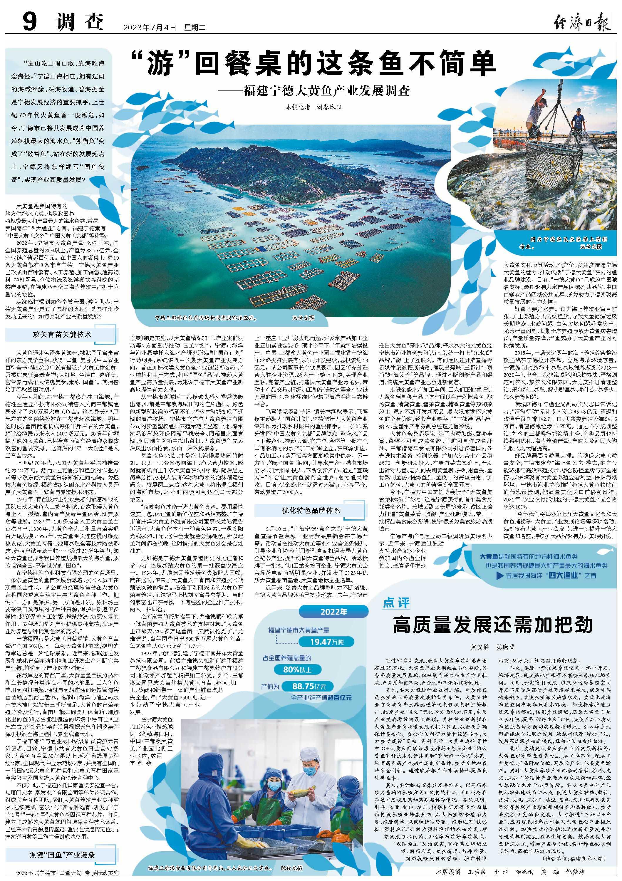 “靠山吃山唱山歌,靠海吃海念海经。”宁德山海相连,拥有辽阔的海域滩涂,耕海牧渔、碧海掘金是宁德发展经济的重要抓手。上世纪70年代大黄鱼曾一度濒危,如今,宁德市已将其发展成为中国养殖规模最大的海水鱼,“熊猫鱼”变成了“致富鱼”。站在新的发展起点上,宁德又将怎样续写“国鱼传奇”,实现产业高质量发展? 大黄鱼是我国特有的地方性海水鱼类,也是我国养殖规模最大和产量最大的海水鱼类,曾居我国海洋“四大渔业”之首。福建宁德素有“中国大黄鱼之乡”“中国大黄鱼之都”等称号。 2022年,宁德市大黄鱼产量19.47万吨,占全国养殖总量的80%以上,产值为88.75亿元,全产业链产值超百亿元。在中国人的餐桌上,每10条大黄鱼就有8条来自宁德。宁德大黄鱼产业已形成由苗种繁育、人工养殖、加工销售、渔药饲料、渔机网具、仓储物流及旅游餐饮等组成的完整产业链,在福建乃至全国海水养殖中占据十分重要的地位。 从濒临枯竭到如今享誉全国、游向世界,宁德大黄鱼产业走过了怎样的历程?是怎样逐步发展起来的?如何实现产业高质量发展? 攻关育苗关键技术 大黄鱼通体色泽亮黄如金,被赋予了富贵吉祥的东方美学色彩,获得“国鱼”美誉。《中国农业百科全书·渔业卷》中就有描述:“大黄鱼体金黄、唇橘红象征富贵吉祥;肉细嫩、色洁白、味鲜美、富营养而成华人传统美食,素称‘国鱼’。其捕捞始于春秋战国时期。” 今年4月底,在宁德三都澳东冲口海域,宁德泩泩渔业科技有限公司销售人员向三都镇渔民交付了330万尾大黄鱼鱼苗。这些身长6.3厘米左右的鱼苗将投放在三都澳环湾海域。明年这时候,鱼苗就能长成每条半斤左右的大黄鱼,预计给渔民带来收入1400多万元。30多年前濒临灭绝的大黄鱼,已摇身变为闽东沿海群众脱贫致富的重要支撑。这背后的“第一大功臣”是人工育苗技术。 上世纪70年代,我国大黄鱼年平均捕捞量约为12万吨。然而,过度捕捞和粗放的作业方式等导致东海大黄鱼资源渐渐走向枯竭。为拯救大黄鱼资源,福建省组织闽东水产科技人员开展了大黄鱼人工繁育与养殖技术研究。 1985年,育苗技术主要攻关者刘家富和他的团队启动大黄鱼人工繁育初试,首次取得大黄鱼海上人工授精、室内育苗及野生鱼保活、驯养成功等进展。1987年,100多尾全人工大黄鱼鱼苗首次育出;1990年,大黄鱼全人工批量育苗实现百万尾规模;1995年,大黄鱼生长速度慢的难题被攻克,大黄鱼网箱与池塘养殖全套技术路线形成,养殖户试养获丰收……经过30多年努力,如今大黄鱼已成为我国养殖规模最大的海水鱼,成为畅销全国、享誉世界的“国鱼”。 在宁德泩泩渔业科技有限公司的鱼苗场里,一条条金黄色的鱼苗欢快游动着,技术人员正在观察鱼苗性状。该公司总经理陈佳曾在大黄鱼育种国家重点实验室从事大黄鱼育种工作。他说:“一方面是保护,另一方面是开发。原种场主要采集自然海域的野生种资源,保护种质遗传多样性,起到保护人工扩繁、增殖放流、资源恢复的作用。良种场则是为产业提供良种支持,满足产业对养殖品种优良性状的需求。” 宁德福鼎市是大黄鱼育苗重镇,大黄鱼育苗量占全国50%以上。每到大黄鱼投苗季,福鼎的海岸边总是一片忙碌景象。近年来,福鼎通过发展机械化育苗养殖和精加工研发生产不断完善产业链,推进渔业产业数字化转型。 在海岸边的育苗厂里,大黄鱼鱼苗按照品种和生长情况分类养在不同的水池里。工人将鱼苗用渔网打捞起,通过与渔船连通的运输管道将鱼苗输送到海上暂养。福鼎市海洋与渔业局水产技术推广站站长王朝新表示,大黄鱼的育苗养殖分阶段进行,育苗厂就如同婴儿保育箱,刚孵化出的鱼卵要在恒温恒湿的环境中培育至3厘米左右,达到最好条件后再根据天气和潮汐条件择机投放至海上渔排,养至成鱼大小。 宁德市海洋与渔业局四级调研员黄少元告诉记者,目前,宁德市共有大黄鱼育苗场90多家,大黄鱼育苗量30亿尾以上,现有省级原良种场2家,全国现代种业示范场2家,并拥有全国唯一的国家级大黄鱼原种场和大黄鱼育种国家重点实验室及国家级大黄鱼遗传育种中心。 不仅如此,宁德还依托国家重点实验室平台,与厦门大学、富发水产有限公司等单位密切合作,组成联合育种团队,紧盯大黄鱼养殖产业良种需求,陆续完成“富发1号”新品种选育,研发了“宁芯1号”“宁芯2号”大黄鱼基因组育种芯片。并且建立了成熟的大黄鱼基因组选择育种技术体系,已经在种质资源遗传鉴定、重要性状遗传定位、抗病抗逆育种等工作中得到成功应用。 强健“国鱼”产业链条 2022年,《宁德市“国鱼计划”专项行动实施方案》制定实施,从大黄鱼精深加工、产业集群发展等7方面重点推动“国鱼计划”。宁德市海洋与渔业局委托东海水产研究所编制“国鱼计划”行动纲要,系统谋划中长期大黄鱼产业发展方向。旨在加快构建大黄鱼全产业链空间格局、产业结构和生产方式,打响“国鱼”品牌,推动大黄鱼产业高质量发展,为建设宁德市大黄鱼产业新高地提供有力支撑。 从宁德市蕉城区三都镇礁头码头搭乘快艇出海,眼前是三都澳海域壮阔的连片渔排。彩色的新型塑胶渔排绵延不绝,将这片海域变成了辽阔的海洋牧场。宁德市官井洋大黄鱼养殖有限公司的新型塑胶渔排养殖示范点坐落于此,深水抗风浪塑胶环保