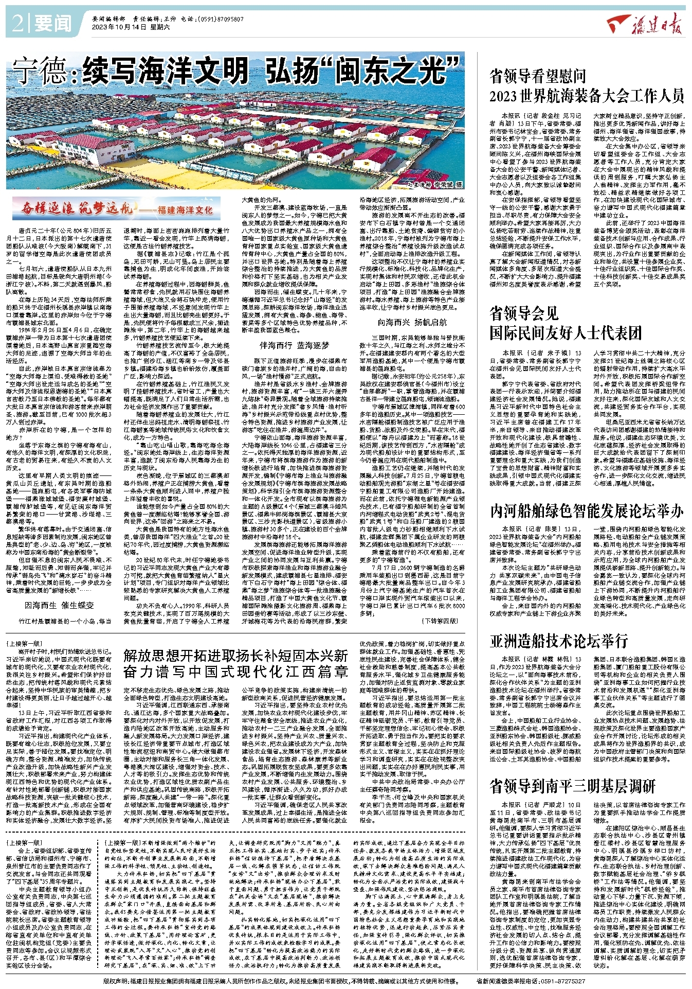 七星渔排 李荣斌 摄 唐贞元二十年(公元804年)旧历五月十二日,日本派出的第十七次遣唐使团船队从难波(今大阪南)解缆南下,31岁的留学僧空海是此次遣唐使团成员之一。 七月初六,遣唐使船队从日本九州田浦港起航,目标是驶向大唐明州港(今浙江宁波)。不料,第二天就遇到暴风,船队离散。 在海上历险34天后,空海法师所乘的船只终于在福州长溪县赤岸镇以南海口漂着靠岸。这里的赤岸如今位于宁德市霞浦县城东北面。 1984年2月26日至4月6日,在确定霞浦赤岸一带为日本第十七次遣唐团使漂着地后,日本高野山真言宗重踏空海大师的足迹,追溯了空海大师当年的生活经历。 自此,赤岸被日本真言宗信徒奉为“空海大师海上漂泊、受难得救的圣地”“空海大师出世走运与成名的圣地”“空海大师及信徒报恩谢德的圣地”“日本真言密教乃至日本佛教的圣地”。每年都有大批日本真言宗信徒和游客前来赤岸朝圣、旅游。截至目前,已有1000批次超3万人到过赤岸。 赤岸所在的宁德,是一个怎样的地方? 坐落于东海之滨的宁德有海有山,有悠久的海洋文明,有深厚的文化积淀,有古老的贸易往来,有经久不衰的人文历史。 这里有早期人类文明的痕迹——黄瓜山贝丘遗址,有东吴时期的造船基地——温麻船屯,有各类军事海防城堡——福鼎潋城城堡、福安廉村城堡、霞浦传胪城堡等,有见证闽东海洋贸易繁荣的港口——甘棠港、沙埕港、三都澳港等。 繁华终有落幕时。由于交通闭塞、信息短缺等诸多因素制约发展,闽东地区曾是典型的“老、少、边、岛、穷”地区,一度被称为中国东南沿海的“黄金断裂带”。 但自强不息的闽东人民不畏难、不服输,知耻而后勇、知弱而奔强,牢记并传承“弱鸟先飞”和“滴水穿石”的奋斗精神,乘着时代发展的巨轮,一步步成为全省高质量发展的“新增长极”…… 因海而生 催生蝶变 竹江村是霞浦县的一个小岛,每当退潮时,海面上密密麻麻排列着大量竹竿,靠近一看会发现,竹竿上爬满海蛎,这便是古法竹蛎养殖技艺。 据《霞浦县志》记载:竹江是个孤岛,无田可耕,无山可垦。岛上居民主要靠捕鱼为生,明成化年间废渔,开始尝试养海蛎。 在养殖海蛎过程中,因海蛎鲜美,鱼蟹常常吞食,先民就用石块围住海蛎养殖海域,但大浪又会将石块冲走,便用竹子围插养殖海域,不经意间发现竹竿上生出大量海蛎,而且比蛎壳生蛎更好。于是,先民便将竹子每根截成三尺余,插进滩涂中,第二年,竹竿上的海蛎越来越多,竹蛎养殖技艺便延续下来。 竹蛎养殖技艺流传至今,极大地提高了海蛎的产值,不仅富裕了全岛居民,也推广到沙江、涵江等南乡一带及邻县乡镇。福建沿海乡镇也纷纷效仿,覆盖面广泛,影响力深远。 在竹蛎养殖基础上,竹江渔民又发明了挂蛎养殖技术,省时省工,产量也大幅提高,既满足了人们日常生活所需,也为社会经济发展作出了重要贡献。 随着海蛎养殖业的发展壮大,竹江村还伴生出妈祖走水、清明海蛎祭祖、竹江海蛎宴等地域传统民俗文化和饮食文化,成为一方特色。 “靠山吃山唱山歌,靠海吃海念海经。”闽东地处海岸线上,生态海洋资源丰富,造就了闽东沿海人民靠海为生的历史与现状。 夜色渐晚,位于蕉城区的三都澳却格外热闹,养殖户正在捕捞大黄鱼,看着一条条大黄鱼顺利进入网中,养殖户脸上洋溢着丰收的喜悦。 谁能想到如今产量占全国80%的大黄鱼曾一度濒临枯竭?能够享誉全国、游向世界,这条“回游”之路来之不易。 大黄鱼是我国特有的地方性海水鱼类,曾居我国海洋“四大渔业”之首。20世纪70年代,因过度捕捞,大黄鱼资源濒临枯竭。 20世纪80年代末,时任宁德地委书记的习近平同志发现大黄鱼产业大有潜力可挖,就把大黄鱼育苗繁殖纳入“星火计划”项目,专门组织对海洋产业领域比较熟悉的专家研究解决大黄鱼人工养殖问题。 功夫不负有心人。1990年,科研人员攻克关键技术,实现了百万尾规模的大黄鱼批量育苗,开启了宁德全人工养殖大黄鱼的先河。 开发三都澳、建设蓝海牧场,一直是闽东人的梦想之一。如今,宁德已把大黄鱼发展成为我国最大养殖规模海水鱼和八大优势出口养殖水产品之一,拥有全国唯一的国家级大黄鱼原种场和大黄鱼育种国家重点实验室、国家级大黄鱼遗传育种中心,大黄鱼产量占全国的80%,并出口世界各地。特别是随着海上养殖综合整治的持续推进,为大黄鱼的品质和价格打下坚实基础,也为相关产业发展和群众就业增收提供保障。 因海而生,催生蝶变。几十年来,宁德遵循习近平总书记念好“山海经”的发展思路,深耕闽东海洋牧场,海洋渔业迅猛发展,拥有大黄鱼、海参、鲍鱼、海带、紫菜等多个区域特色优势养殖品种,不断丰盈我国蓝色粮仓。 伴海而行 蓝海逐梦 眼下正值旅游旺季,漫步在福鼎市硖门畲族乡的渔井村,广阔的海,自由的风,一场“渔村慢游”正式启航。 渔井村是省级水乡渔村、金牌旅游村,旅游资源丰富,有“一礁三井六崖弄九熔脉”奇异景观。随着全域旅游持续推进,渔井村充分发挥“畲乡风情·渔村听涛”乡村振兴示范带沿线重点村优势,整合特色资源,推进乡村旅游产业发展,让游客“吃住在渔井,游遍周边井”。 宁德依山面海,海洋旅游资源丰富,大陆海岸线长1046公里,占福建省三分之一。依托得天独厚的海洋旅游资源,近年来,宁德市将滨海旅游作为旅游的新