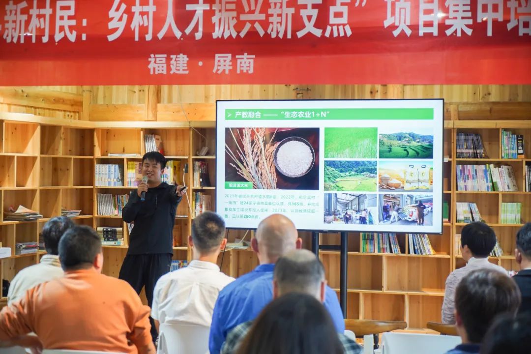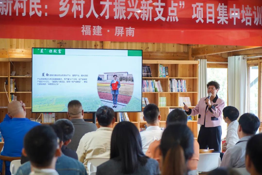 屏南乡村振兴研究院副院长周芬芳结合自身多年来参与屏南县发展文创与文旅的实践经验作《弱鸟先飞——‘文创+文旅’推进乡村振兴的屏南实践》演讲。详细讲述了屏南积极发扬“弱鸟先飞”精神,通过“三引三创”发展乡村文创与文旅经济,探索闽东特色的乡村振兴之路,从一个贫困的山区落后县蜕变为建设生态文明与文创文旅融合强县的历程。她的分享引起了在场学员的强烈共鸣与自豪,让屏南在地人才看到了屏南乡村的新可能与新价值。