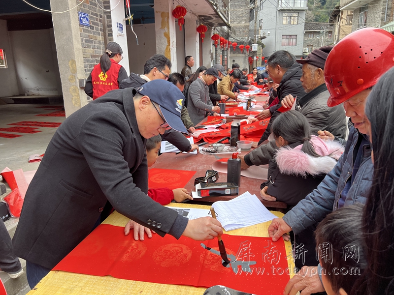 今日屏南消息(宋潇曼)春节将至,年味渐浓,为弘扬中华优秀传统文化,营造春节热闹喜庆、欢乐祥和的春节氛围。1月21日,屏南县10余名书法家联合长桥镇新时代文明实践所走进长桥古街开展“迎春送福写春联 文化下乡暖人心”文化活动。一张张福字、一副副对联,给村民们送去对龙年新春的美好祝福。 活动中,书法家们拿起毛笔,蘸上墨汁,在纸上挥毫泼墨,将真诚的祝福付诸笔下,一副副寓意吉祥、充满喜庆的春联在他们的笔下应运而生。“迎春接福”“吉祥如意”“五福临门”……一幅幅春联不仅传递着祝福,也寄托着人们对新春的憧憬和向往。村民们晾对联、收对联,互相讨论着各副春联的蕴意,大家脸上都洋溢着幸福的笑容。 |