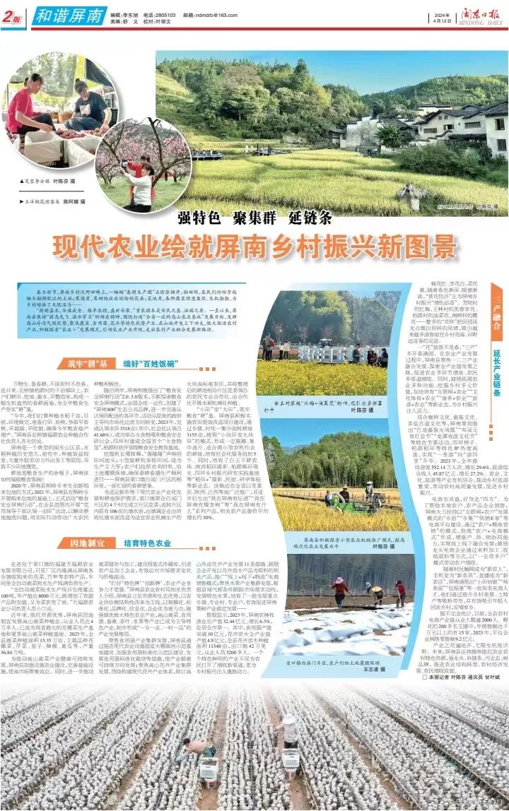 春日时节,屏南乡村沃野田畴上,一幅幅“春耕生产图”正徐徐铺开:稻田间,农民们纷纷拿起锄头翻耕肥沃的土地;果园里,果树绽放出缤纷的花朵;菜地里,各种蔬菜绿意盎然、生机勃勃,为乡村增添了无限活力…… “猗猗嘉禾,今盈我仓。粮丰农稳,盛世安康。”重农固本是安民之基、治国之要。一直以来,屏南县秉持“弱鸟先飞、滴水穿石”的闽东精神,围绕打造“全省一流的高山农业基地”发展目标,发挥高山冷凉气候优势,聚焦蔬菜、食用菌、花卉等特色优势产业,在山地开发上下功夫,做大做活农村产业,积极探索“农业+”发展模式,引领农业产业升级,走出农村产业融合发展新路径。 ![]() ![]() 稻田里的厦地村 叶陈芬 摄 万物生、备春耕,不误农时不负春。连日来,长桥镇柏源村的千亩梯田上,农户们耕田、挖地、蓄水、平整苗床,构成一幅生机盎然的春耕画卷,为全年粮食生产夯实“耕”基。 “今年,我们打算种植水稻千亩,目前,田埂做完,准备打田、育秧,争取早育秧、早栽插、早收割,确保今年粮食稳产增产。”屏南县长桥镇福源农业种植合作社负责人苏光信说。 ![]() 白玉村实施“水稻+油菜花”轮作,吸引众多游客打卡 叶陈芬 摄 屏南是一个典型的闽东山区县,水稻种植历史悠久,前些年,种植效益较差、大量年轻劳动力外出务工等原因,导致不少田地撂荒。 耕地是粮食生产的命根子,屏南该如何端稳粮食饭碗? 2020年,屏南县熙岭乡率先创新购米包地的方式;2021年,屏南县在熙岭乡开展购米包地的基础上,正式启动“粮食安全屏南行动”,在全县范围内开展“党员领导干部认领一亩田”活动,以解决耕地抛荒问题,用实际行动带动广大农民种粮积极性。 随后两年,屏南相继推出了“粮食安全屏南行动”2.0、3.0版本,不断探索粮食安全屏南模式,由国企统一运作,创建了“屏南800”生态公共品牌,进一步完善从认领到配送的各环节,活动从原来的政府主导向市场化运营方向转变,2023年,完成认领水田3318亩(其中,社会化认领占41.68%),成功举办大食物观和粮食安全研讨会,四坪村建成全国首个“大食物馆”,柏源村获评省级粮食安全教育基地。 ![]() 屏南县积极探索小型农业机械推广模式,提高现代化农业发展水平 叶陈芬 摄 挖掘机长臂挥舞,“轰隆隆”声响彻田间地头;小型旋耕机穿梭田间,成为生产主力军;农户们抢抓有利时机,给土地覆膜保墒,确保春耕春播生产顺利进行……屏南县棠口镇白溪门片区的稻田里,一派忙碌的春耕景象。 为适应新形势下现代农业产业化发展和耕地保护需求,棠口镇联合白溪门片区的4个村庄成立片区党委,流转片区内原有106亩坑塘水面,由镇属企业出资将坑塘水面改造为适宜农业机械生产的大块高标准农田,并将整理后的耕地租给片区党委领办的农民专业合作社,由合作社开展水稻机械化种植。 “小田”变“大田”,筑牢粮食“耕”基。屏南县积极实施农田提效改造项目建设,通过乡镇、村统一集中流转耕地3155亩,按照“小块田变大块田”的模式,形成一定规模、集中连片、适合微小型农机作业的耕地,培育社会化服务组织5个。同时,培育了白玉不耕农场、南湾稻田摄影、柏源梯田观光、四坪乡村振兴研究实践基地等“稻田+”摄影、民宿、研学体验等新业态。该做法在全省以及重庆、陕西、江西等地广泛推广,并逐步衍生出“我在屏南有坛酒”“我在屏南有棵李树”等“我在屏南有什么”系列产品,相关农产品售价平均增长约30%。 ![]() 走进位于棠口镇的福建天福源农业发展有限公司,只见厂区内堆满从屏南各乡镇收购来的花菜、竹笋等农特产品,车间里全自动蔬菜脱水生产线满负荷生产。 “全自动蔬菜脱水生产线日处理量达100吨,年产值达8000万元,既增加了农副产品附加值,又为菜农兜了底。”天福源农业公司负责人苏小兰说。 ![]() 棠口镇白溪门片区,农户们给土地覆膜保墒 王志凌 摄 近年来,依托资源优势,屏南县因地制宜发展高山蔬菜种植业,从业人员达4万多人,已成为我省最大的花椰菜生产基地和夏季高山蔬菜种植基地。2023年,全县蔬菜种植面积15.35万亩,主栽品种花椰菜、芹菜、茄子、辣椒、黄瓜等,产量36.84万吨。 为推动高山蔬菜产业健康可持续发展,屏南县加强设施农业建设,完善基础设施,提高市场聚集效应。同时,进一步推动蔬菜储存与加工,建设组装式冷藏库,引进农产品加工企业,有效应对市场需求变化与价格波动。 “打好‘特色牌’‘创新牌’,农业产业竞争力才更强。”屏南县农业农村局相关负责人介绍,屏南县立足资源和生态优势,以农业供给侧结构性改革为主线,以规模化、标准化、品牌化、信息化、企业化为着力点,做强做优做大特色农业产业,高山蔬菜、食用菌、畜禽、茶叶、水果等产业已成为主导特色产业,初步形成“一乡一业、一村一品”的产业发展格局。 ![]() 木耳采收忙 王志凌 摄 聚焦食用菌产业集群发展,屏南县通过推进现代农业设施温室大棚栽培示范基地建设、加强食用菌标准化示范区建设、发展食用菌标准化栽培等措施,使产业朝着可持续方向发展;聚焦高山花卉产业集群发展,围绕构建现代花卉产业体系,修订高山冷凉花卉产业发展11条措施、鼓励企业开发以花卉苗木产品为原料的相关产品、推广“线上+线下+物流”电商销售模式;聚焦水果产业集群发展,根据县域气候条件跟踪市场需求动向,