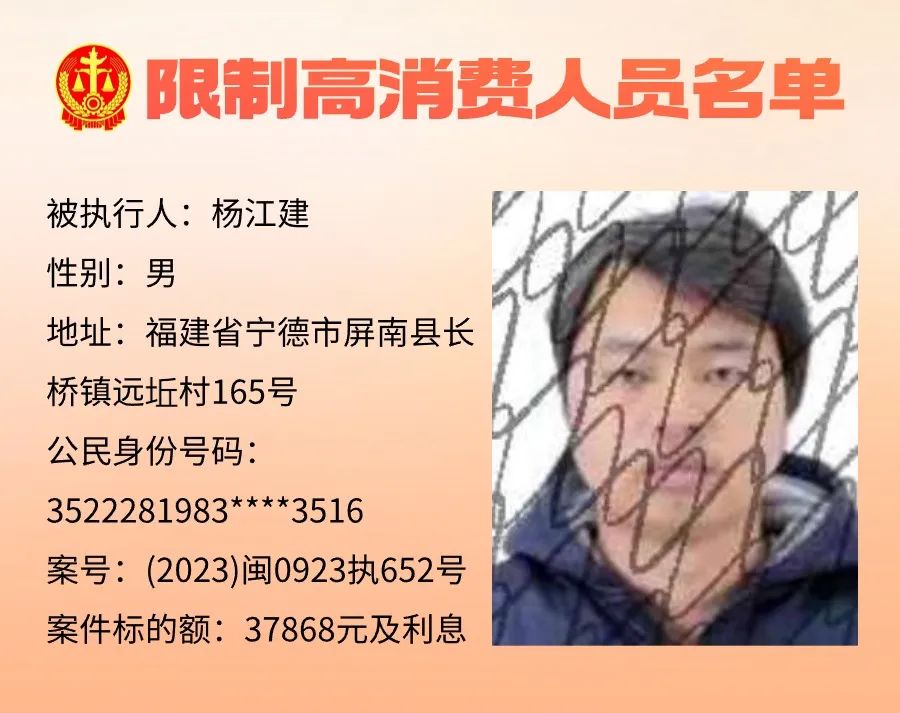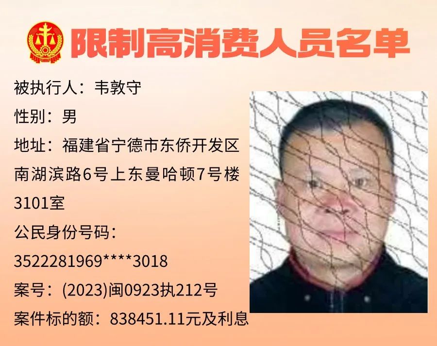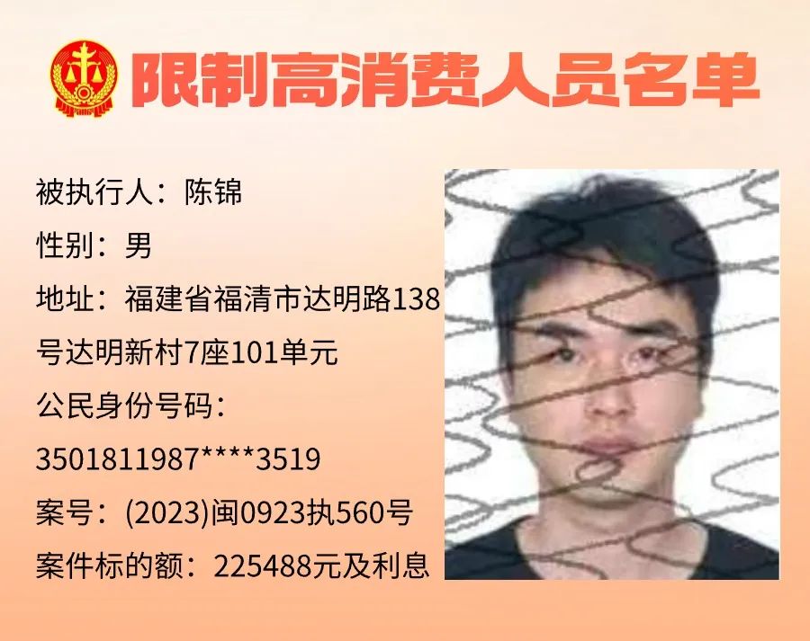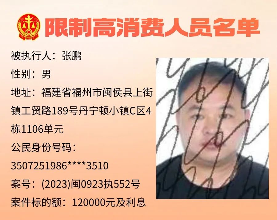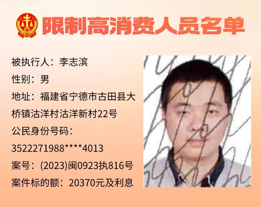 为维护生效法律文书的严肃性,切实保护申请执行人的合法权益,本院依法对限制高消费的被执行人进行公开曝光,请广大群众对以下被执行人予以监督、举报,举报电话:0593-2102686。 ![]() ![]() ![]() ![]() ![]() ![]() ![]() ![]() ![]() ![]() 限制高消费令 被执行人不履行法律文书确定的义务,法院依法责令以上人员不得有《最高人民法院关于限制被执行人高消费及有关消费的规定》第三条规定的高消费及非生活和工作必须的消费行为。 (一)乘坐交通工具时,选择飞机、列车软卧、轮船二等以上舱位;(二)在星级以上宾馆、酒店、夜总会、高尔夫球场等场所进行高消费; (三)购买不动产或者新建、扩建、高档装修房屋; (四)租赁高档写字楼、宾馆、公寓等场所办公; (五)购买非经营必需车辆; (六)旅游、度假; (七)子女就读高收费私立学校; (八)支付高额保费购买保险理财产品; (九)乘坐G字头动车组列车全部座位、其他动车组列车一等以上座位等其他非生活和工作必需的消费行为。 被执行人为单位的,将采取限制消费措施后,被执行人及其法定代表人、主要负责人、影响债务履行的直接责任人员、实际控制人不得实施前款规定的行为。因私消费以个人财产实施前款规定行为的,可以向执行法院提出申请。执行法院审查属实的,应予准许。 温馨提示 本次公布的名单仅代表其截止到2024年4月26日仍未履行义务,对于已发送的内容,微信不提供修改功能,在被执行人履行义务后,将会从限制高消费名单中删除。 来源:屏南法院 |