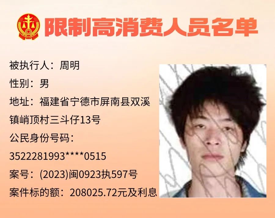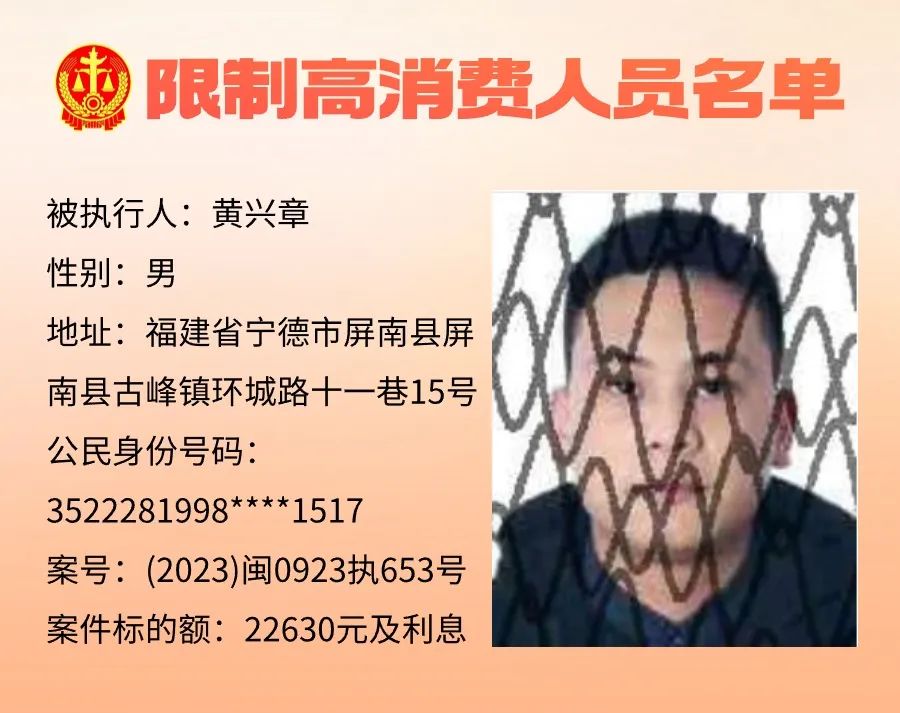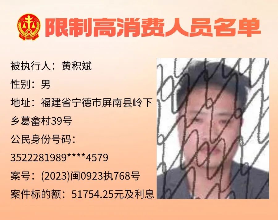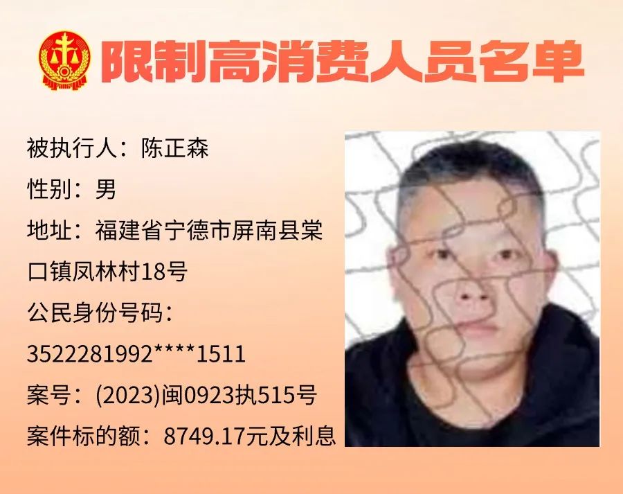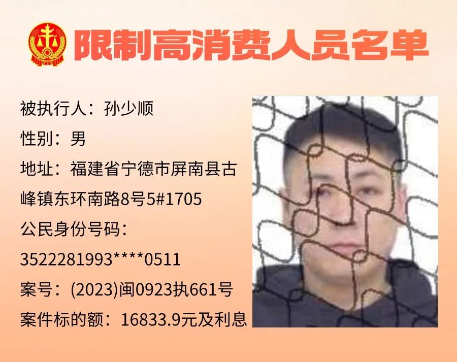 为维护生效法律文书的严肃性,切实保护申请执行人的合法权益,本院依法对限制高消费的被执行人进行公开曝光,请广大群众对以下被执行人予以监督、举报,举报电话:0593-2102686。 ![]() ![]() ![]() ![]() ![]() ![]() ![]() ![]() ![]() ![]() 限制高消费令 被执行人不履行法律文书确定的义务,法院依法责令以上人员不得有《最高人民法院关于限制被执行人高消费及有关消费的规定》第三条规定的高消费及非生活和工作必须的消费行为。 (一)乘坐交通工具时,选择飞机、列车软卧、轮船二等以上舱位;(二)在星级以上宾馆、酒店、夜总会、高尔夫球场等场所进行高消费; (三)购买不动产或者新建、扩建、高档装修房屋; (四)租赁高档写字楼、宾馆、公寓等场所办公; (五)购买非经营必需车辆; (六)旅游、度假; (七)子女就读高收费私立学校; (八)支付高额保费购买保险理财产品; (九)乘坐G字头动车组列车全部座位、其他动车组列车一等以上座位等其他非生活和工作必需的消费行为。 被执行人为单位的,将采取限制消费措施后,被执行人及其法定代表人、主要负责人、影响债务履行的直接责任人员、实际控制人不得实施前款规定的行为。因私消费以个人财产实施前款规定行为的,可以向执行法院提出申请。执行法院审查属实的,应予准许。 温馨提示 本次公布的名单仅代表其截止到2024年4月26日仍未履行义务,对于已发送的内容,微信不提供修改功能,在被执行人履行义务后,将会从限制高消费名单中删除。 来源:屏南法院 |