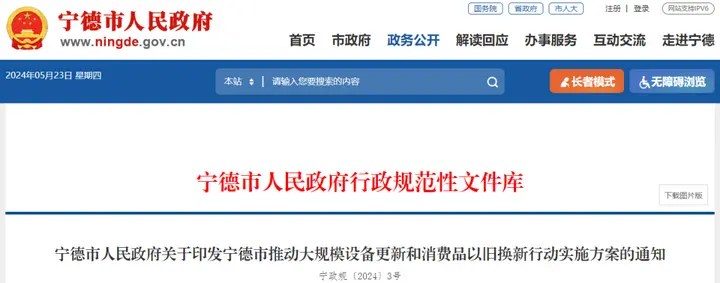 最新! 宁德市人民政府印发通知 《宁德市推动大规模设备更新和消费品以旧换新行动实施方案》出台!