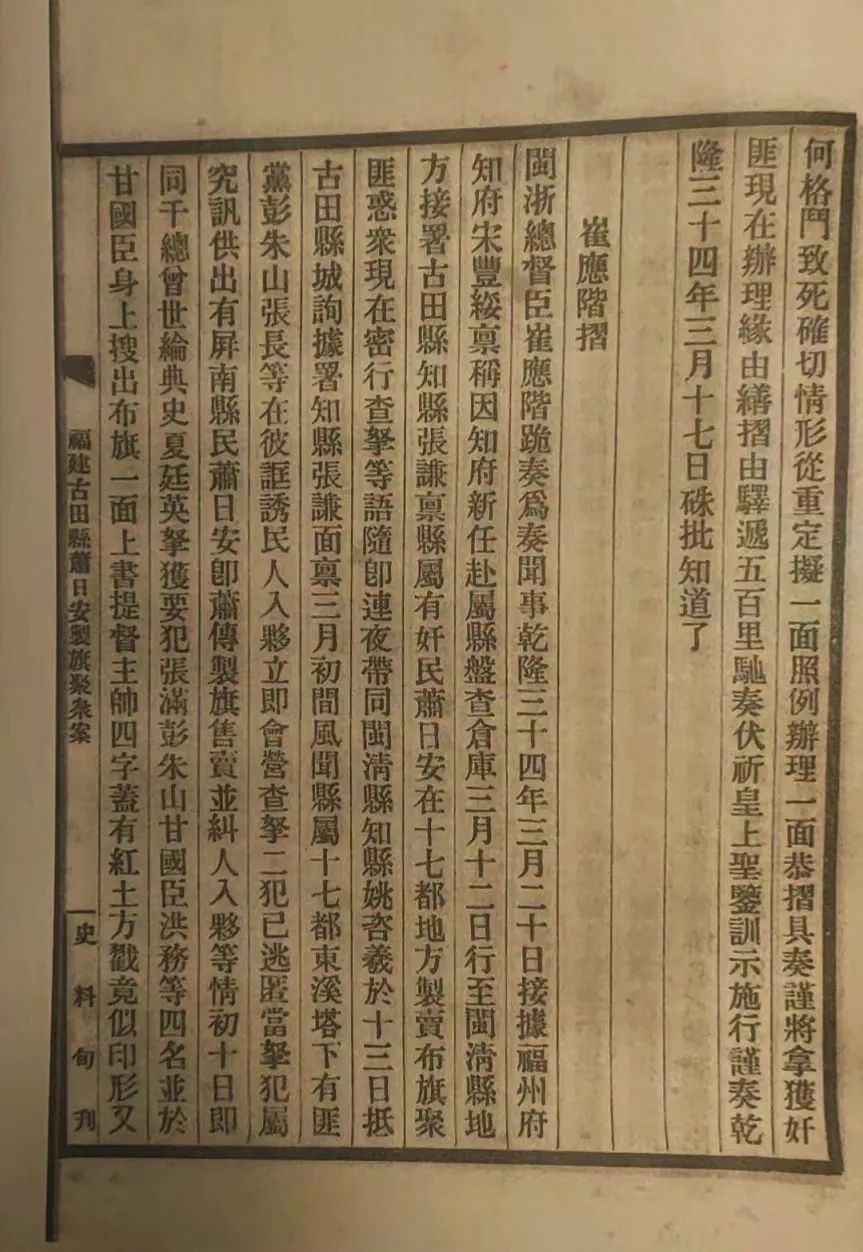 《戍台忠烈薛文潮》连载 第三辑少年飞澄 第七节 解围双溪(下) 十二日,福州府新任知府宋丰绥例行赴属县闽清盘查仓库,恰逢古田知县张谦遣快马向闽清知县姚咨羲求援,急报“有奸民萧日安在十七都地方制卖布旗,聚匪惑众,现在密行查拏等语”,随即带同姚咨羲披星戴月连夜驰往古田县城。 十三日,宋丰绥与姚咨羲抵达古田县城,详细咨询萧日安攻城一案始末。是日,适福协左军都司宋世爵亦因外出巡查,“汛闻信驰至古田县城”。宋丰绥显示出干练的办事能力,“随即一面究追首伙,一面会同宋世爵分路擒拏,供出要犯”。福建巡抚鄂宁收到知县张谦快报后,随即檄委署福协副将福格即日驰往古田,分起押解人犯赴省城,又派委巡道达明驰赴古田县督同宋丰绥等协力查拿余党,在短短三日之内,官兵搜遍屏古大地,薛文潮协助擒捕,拏获头目陈允治、钱保等四十二人,全部严密收禁入狱,并缴获印戳一枚、布旗数捆、火铳火药、弓箭刀枪等若干。 十七日,鄂宁具檄文报送闽浙总督崔应阶,并拟定奏摺由驿递五百里驰奏乾隆皇帝,得到赞赏奖赏催办以及务必“究明萧日安果否实在系匪首”等详细朱批。 二十日,闽浙总督崔应阶拟定奏摺上奏乾隆皇帝,得到朱批。 ![]() 清乾隆年间古田县境图 清《史料询刊》记载了福建古田县萧日安制旗聚众案两份奏摺,一份是福建巡抚鄂宁上的,另一份是闽浙总督崔应阶上的。奏摺如下: 鄂宁摺 福建巡抚革职留任臣鄂宁谨奏 为奏闻事乾隆三十四年三月十六日,接据福州府知府宋丰绥禀称,因知府新任赴属县盘查仓库,三月十二日行至闽清县地方接署古田县知县张谦禀县属有奸民萧日安在十七都地方制卖布旗,聚匪惑众,现在密行查拏等语,随即连夜带同闽清县知县姚咨羲于十三日抵古田县城询。据署知县张谦面禀,三月初间,风闻县属十七都东溪塔下有匪党彭朱山、张长等在彼诓诱民人入伙,立即会营查拿二犯,已逃匿,当拿犯属究讯,供出有屏南县民萧日安即萧傅制旗售卖,并纠人入伙等情。初十日,即同千总曾世纶典史夏廷英拿获要犯张满彭朱山甘国臣洪务等四名,并于甘国臣身上搜出布旗一面,上书提督主帅四字,盖有红土方戳,竟拟印形。又搜出小铜笤一对,长止寸余,并据乡民陈士赞陈其善等探知萧日安潜匿处所,该乡民等(朱批 此乡民宜酌赏)即持锄头草刀星往帮捕竟将萧日安砍落头颅,禀檄首级,当即文武会同前赴各犯家内逐细搜检并无别项悖逆字迹亦无违禁器具业经讯出伙党二十余名分头擒捕等语,是日适福协左军都司宋世爵亦因巡查营汛,闻信驰至古田县城,宋丰绥随即一面究追首伙,一面会同宋世爵分路擒拿供出要犯,先后已拿获陈允治钱保等四十二名。现在严密收禁仍行究追擒拿务尽根株等情到臣。臣查古田县虽山僻小邑,离省止二百余里乃竟有不法奸民潜行制旗纠伙,虽搜无悖逆踪迹,亦未有拒捕情事即其制旗造印显系不轨情形(朱批 自然岂可宽纵),时值该府知府宋丰绥盘查属邑闻信驰往,经该署知县张谦会同驻防千总曾世纶擒获要犯,搜出布旗铜笤。三日之内究捕党伙四十余名,虽未据讯报供情其为不法奸匪已无疑义。臣查古田县城居崇山峻岭之中,甚为荒僻,现在拿禁奸匪四十余名防范非易(朱批 是应速结正法),随即檄委署福协副将福格即日驰往,一面分起押解人犯赴省(朱批 速定案驰奏),一面督同搜捕余匪弹压。地方又派委巡道达明驰赴古田县督同宋守等妥协查拿余党,并搜起布旗印戳,确查实在情形,勿致稍有纵漏滋扰,其人犯数日即可陆续解到随到,臣随即督同司道严密究审,务得其如何制旗售卖谋为不轨确情,并究明萧日安果否实在系匪首,如何格斗致死确切情形,从重定拟,一面照例办理,一面恭摺具奏谨将拿获奸匪,现在办理缘由缮摺由驿递五百里驰奏。 伏祈皇上圣鉴训示。施行谨奏。 朱批 知道了 乾隆三十四年三月十七日 ![]() 闽浙总督崔应階折《史料旬刊第十六期》记载古田烧萧日安制旗聚众案 崔应阶摺 闽浙总督臣崔应阶跪奏 为奏闻事乾隆三十四年三月二十日,接据福州府知府宋丰绥禀称,因知府新任赴属县盘查仓库,三月十二日,行至闽清县地方接署古田县知县张谦禀县属有奸民萧日安在十七都地方制旗卖布旗聚匪惑众。现在密行查拏等语。随即连夜带同闽清县知县姚咨羲于十三日抵古田县城。询据署知县张谦面禀,三月初间,风闻县属十七都东溪塔下有匪党彭朱山张长等在彼诓诱民人入伙。立即会营查拏。二犯已逃匿,当拏犯属究讯供出有屏南县民萧日安即萧傅,制旗售卖并纠人入伙等情。初十日,即同千总曾世纶典史夏廷英拏获要犯张满彭朱山甘国臣洪务等四名,并于甘国臣身上搜出布旗一面,上书提督主帅四字,盖有红土方戳,竞似印形,又搜出小铜笤一对,长止寸余,并据乡民陈士赞陈其善等探知萧日安潜匿处所,该乡民等即持锄头草刀星往帮捕,竟将萧日安砍落头颅,禀檄首级,当即文武会同前赴各犯家内逐细搜检,并无别项悖逆字迹,亦无违禁器具业经讯出伙党二十余名,分头擒捕等语。是日适福协左军都司宋世爵亦因巡查,汛闻信驰至古田县城,宋丰绥随即一面究追首伙,一面会同宋世爵分路擒拏,供出要犯,先后已拏获陈允治钱保等四十二名,现在严密收禁仍行究追擒拏,务尽根株等情,到臣臣查古田县虽离省仅二百余里,但在崇山峻岭之中,易于藏奸,萧日安等竟敢制旗散卖,不法已极,虽搜无悖逆踪迹,然敢于
