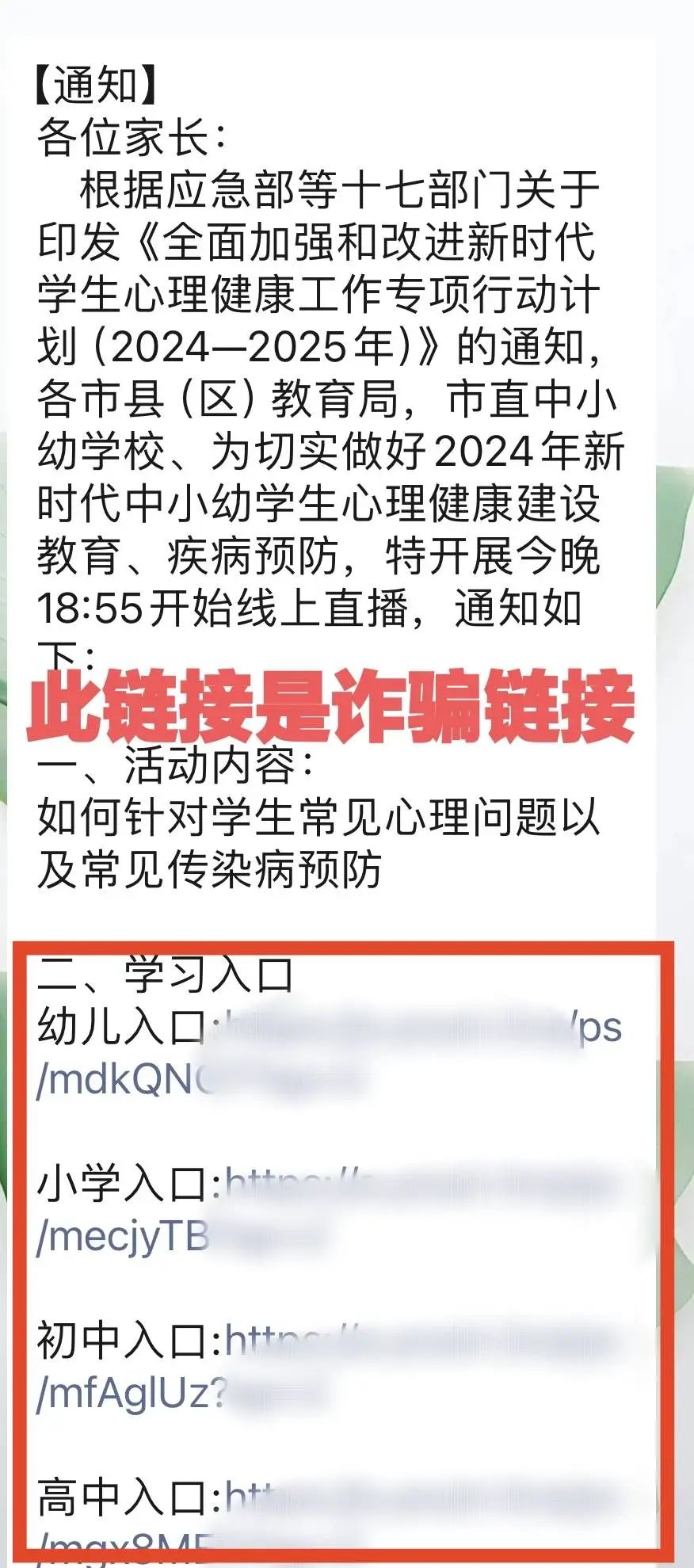 请广大师生及家长如收到此类消息,不要点击链接,谨防诈骗!