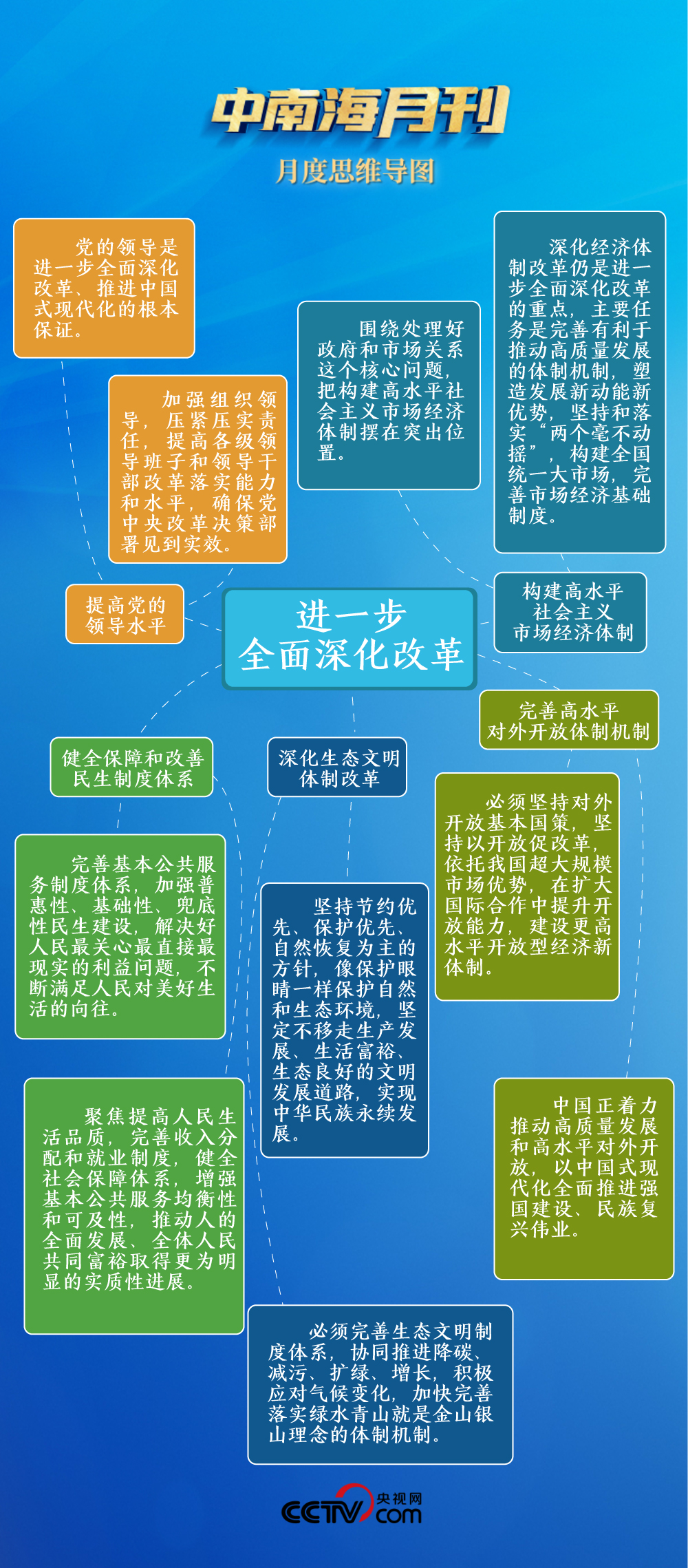 “改革开放后,党的历届三中全会都是研究改革。这一次改革,我们将紧扣推进中国式现代化主题。”聚焦进一步全面深化改革,党的二十届三中全会审议通过的《决定》中,“改革”出现了144次;在全会《公报》中,进一步全面深化改革的总目标、重大原则等得到系统阐释。“改革”再度成为关注热词。 本月,从内政到外交,习近平总书记多次就改革开放作出重要指示和对外政策宣示,“新时代新征程上,要开创中国式现代化建设新局面,仍然要靠改革开放”。 进一步全面深化改革必须坚持和加强党的全面领导。“党的领导是进一步全面深化改革、推进中国式现代化的根本保证。”习近平总书记在关于二十届三中全会《决定》的说明中,对坚持党中央对进一步全面深化改革的集中统一领导作出新部署,提出要完善党中央重大决策部署落实机制。 进一步全面深化改革必须坚持对外开放。中亚之行,成果丰硕。五天四夜,三十余场重要活动,习近平主席在多个场合讲述中国着力推动高水平对外开放、中国与世界合作共赢的故事,欢迎各国“共享中国发展机遇”。 深化经济体制改革仍是进一步全面深化改革的重点。7月30日召开的中央政治局会议为下半年经济工作把脉定向,提出“要坚持和落实‘两个毫不动摇’,促进各种所有制经济优势互补、共同发展,完善产权保护、市场准入、破产退出等市场经济基础制度”。 绿色是进一步全面深化改革的亮丽底色。本月,上海合作组织国家间首个以绿色发展为主题的高级别活动——上海合作组织国家绿色发展论坛在青岛启幕。习主席向论坛致贺信,希望“同各方加强绿色发展领域交流合作,助力各国经济社会可持续发展,促进人与自然和谐共生”。 ………… 一系列重要指示、重要部署,为进一步全面深化改革、推进中国式现代化谋新篇。