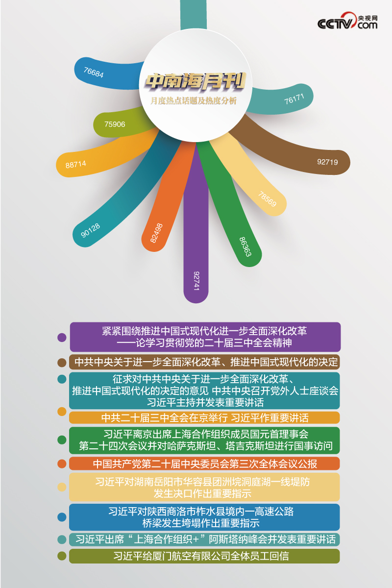 央视网“智闻”系统提取分析2024年7月全网时政新闻热点显示,本月“中共中央关于进一步全面深化改革、推进中国式现代化的决定”“中共二十届三中全会在京举行 习近平作重要讲话”等话题备受关注。 7月15日至18日,党的二十届三中全会在北京举行。会上,习近平总书记开宗明义:“把中国式现代化蓝图变为现实,根本在于进一步全面深化改革。”