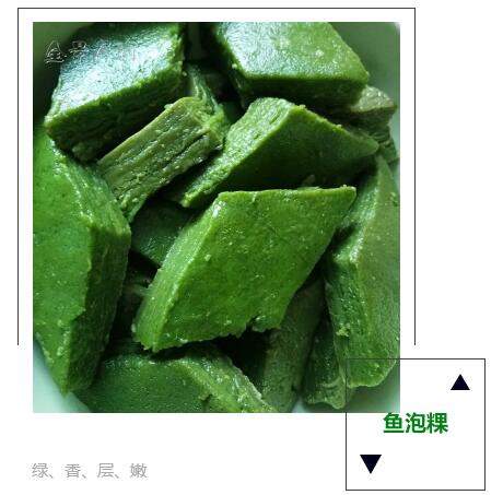 若说这鱼泡粿的特点,可用四字概括:绿、香、层、嫩。绿,指的是其色,由于其料取之于叶,故其色因用量的多寡显嫩绿到深绿不等;香指的是其味,鱼泡树之叶富藏香味,因此做成的粿有种说不出的草木之香;层,指的是其形,此粿是由层层的簿面叠成的,因每层有量有搅拌不同,做成后纹理、色泽和图案也有不同,仿佛写意的山水画;嫩,指的是口感,鱼泡粿柔滑纤细,吃起来鲜嫩可口,老少皆宜。 如此色、香、味、形俱全的美食,虽然原料非常简单,主要是稻米和鱼泡树叶,但要做好可不简单,甚至颇有点讲究,如摘的须是端午的新叶,磨的最好是上年刚割的新米,否则,色泽与口感就有偏差。至于工序,依次是搓、浸、磨、拌、蒸、切。简而言之,就是将树叶用清水洗净后反复搓揉,去其浓汁,然后加入适量稻米一起浸泡,放上三五个时辰,等两者充分渗透后倒入石磨,经碾后变成绿色的米浆,然后再加入葱叶、少许盐及其它佐料,反复搅拌,让其混合均匀,难分彼此,接着,倒入铺了白纱布的竹笼去蒸,在蒸的过程中,等到半熟后,再倒入一层新米浆,然后继续蒸,如此反复,一层又一层,一般可加五到七层。当全部蒸好后,取出凉干后,就可进行最后一道工序了,即切块定型,圆形、方形、或者其它什么图案,总之,随你所愿,自由发挥,不过最常见的是菱形。 这样,一盘鲜嫩的鱼泡粿就可以品尝了。说到食用,山野村夫,没啥讲究,即可主食,也可作菜,或煎或炒,甚至直接沾着酱油配稀粥。至于吃法,更是随意,可大块大块的吞,也可一片一片的咬。儿时的我们,总习惯边吃边玩,粿面被一层层的剥起,边吃边比较,比薄比色比花纹,看着那隐约可见的树叶纤维,你可以充分发挥想象,似山、似水似云纹,然后带着满足的心情轻轻地撕,细细地咬,慢慢地咽。以至现在看小孩玩泡泡糖,就忍不住想起儿时的鱼泡粿…… 鱼泡粿口味虽好,但不宜多吃,吃多了会有轻微头昏的,那感觉就跟偷尝新酒小醉后一样。