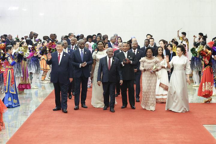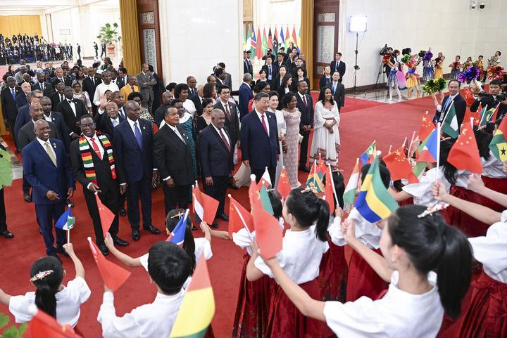 9月4日晚,国家主席习近平和夫人彭丽媛在北京人民大会堂举行宴会,欢迎来华出席中非合作论坛北京峰会的非方及国际贵宾。这是习近平发表致辞。新华社记者 姚大伟 摄 9月4日晚,国家主席习近平和夫人彭丽媛在北京人民大会堂举行宴会,欢迎来华出席中非合作论坛北京峰会的非方及国际贵宾。这是习近平发表致辞。新华社记者 谢环驰 摄 新华社北京9月4日电(记者温馨、董雪)9月4日晚,国家主席习近平和夫人彭丽媛在北京人民大会堂举行宴会,欢迎来华出席中非合作论坛北京峰会的非方及国际贵宾。 中共中央政治局常委李强、赵乐际、王沪宁、蔡奇、丁薛祥、李希出席。 9月的北京,秋高气爽。雄伟的人民大会堂内,中国国旗和中非合作论坛成员国国旗以及非洲联盟旗帜交相辉映。 出席论坛峰会的51个非洲国家元首、政府首脑及配偶,2位总统代表,非盟委员会主席和联合国秘书长等贵宾陆续抵达人民大会堂。习近平和彭丽媛热情迎接,同他们分别握手问候,并集体合影留念。 9月4日晚,国家主席习近平和夫人彭丽媛在北京人民大会堂举行宴会,欢迎来华出席中非合作论坛北京峰会的非方及国际贵宾。这是宴会前,习近平和彭丽媛同贵宾们集体合影留念。新华社记者 丁林 摄 活泼可爱的少年儿童唱起优美的歌曲,打起欢快的非洲鼓,载歌载舞,对远道而来的国际贵宾表示热烈欢迎。 9月4日晚,国家主席习近平和夫人彭丽媛在北京人民大会堂举行宴会,欢迎来华出席中非合作论坛北京峰会的非方及国际贵宾。这是在前往宴会厅沿途,少年儿童对国际贵宾表示热烈欢迎。新华社记者 张领 摄 9月4日晚,国家主席习近平和夫人彭丽媛在北京人民大会堂举行宴会,欢迎来华出席中非合作论坛北京峰会的非方及国际贵宾。这是在前往宴会厅沿途,少年儿童对国际贵宾表示热烈欢迎。新华社记者 张领 摄 9月4日晚,国家主席习近平和夫人彭丽媛在北京人民大会堂举行宴会,欢迎来华出席中非合作论坛北京峰会的非方及国际贵宾。这是在前往宴会厅沿途,少年儿童对国际贵宾表示热烈欢迎。新华社记者 庞兴雷 摄 9月4日晚,国家主席习近平和夫人彭丽媛在北京人民大会堂举行宴会,欢迎来华出席中非合作论坛北京峰会的非方及国际贵宾。这是在前往宴会厅沿途,少年儿童对国际贵宾表示热烈欢迎。新华社记者 高洁 摄 在悠扬的迎宾曲中,习近平和彭丽媛同贵宾们共同步入宴会厅。 9月4日晚,国家主席习近平和夫人彭丽媛在北京人民大会堂举行宴会,欢迎来华出席中非合作论坛北京峰会的非方及国际贵宾。这是习近平和彭丽媛同贵宾们共同步入宴会厅。新华社记者 刘彬 摄 9月4日晚,国家主席习近平和夫人彭丽媛在北京人民大会堂举行宴会,欢迎来华出席中非合作论坛北京峰会的非方及国际贵宾。这是习近平和彭丽媛同贵宾们共同步入宴会厅。新华社记者 翟健岚 摄 习近平发表致辞,代表中国政府和中国人民热烈欢迎各位嘉宾。 习近平指出,每次同非洲朋友见面,我都倍感亲切,尤其深切感受到,中非命运共同体建设基础牢、起点高、前景广,为构建人类命运共同体树立了光辉典范。中非命运共同体根植于传统友好,彰显于合作共赢,壮大于与时偕行。中国同非洲国家在反帝反殖反霸的斗争中并肩奋斗,在发展振兴、逐梦现代化的道路上携手同行,在抗击新冠疫情中守望相助,在重大国际和地区问题上通力协作。不论国际形势如何变化,中非友谊赓续传承、历久弥坚。 习近平强调,构建命运共同体是人类的共同梦想,现代化是梦想连接现实的必由之路。无论过去还是现在,中非都是构建命运共同体的先行者,未来也必将携手走在现代化进程的前列。我相信,只要28亿多中非人民同心同向,就一定能在现代化道路上共创辉煌,引领全球南方现代化事业蓬勃发展,为构建人类命运共同体作出更大贡献。 论坛共同主席国塞内加尔总统法耶代表非方领导人感谢友好的中国人民给予的盛情款待和周到安排,表示非中友好根基深厚、源远流长,双方理念相近,平等相待、相互尊重、互利共赢、团结合作,都主张建设一个更加平等有序、普惠包容的世界。在习近平主席领导下,中国不仅实现自身快速发展,而且为促进世界和平与增长作出重要贡献。非方高度赞赏习近平主席提出的系列重要倡议以及为推动中非合作包括论坛机制建设作出的重要贡献,愿同中方加强团结合作,深化非中全面战略合作伙伴关系,更好维护共同利益。 宴会后,习近平和彭丽媛同贵宾们共同观看《携手同行,共筑未来》文艺演出。演出展现了中非多彩文明美美与共、中非人民相知相亲,赢得阵阵热烈掌声。 王毅、尹力、李书磊、何立峰、王小洪等出席上述活动。 |