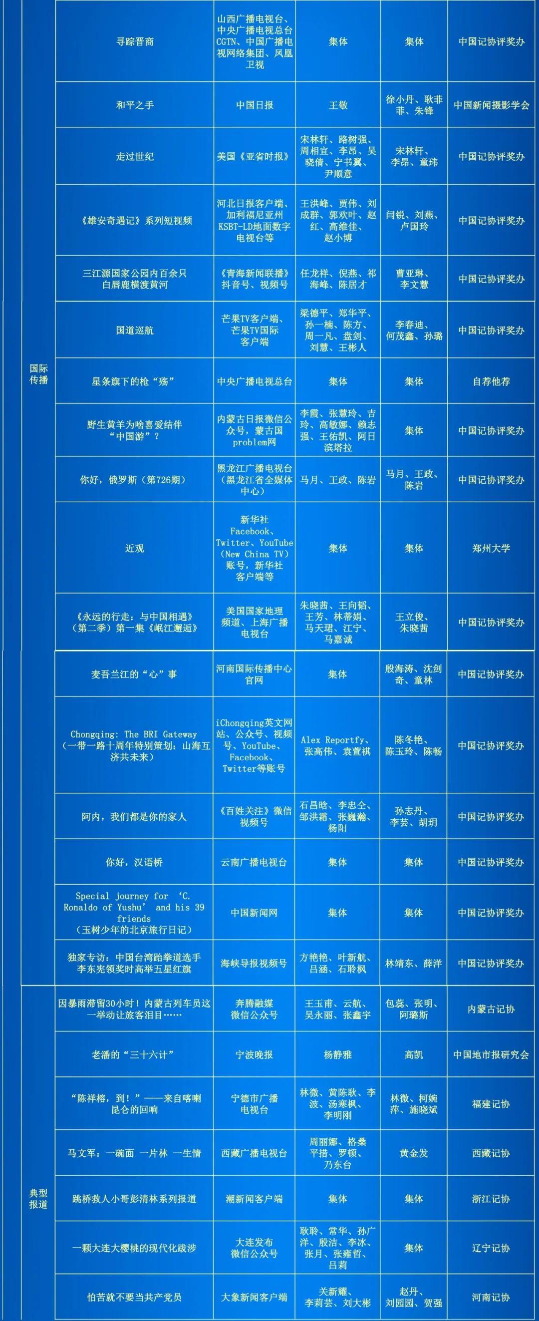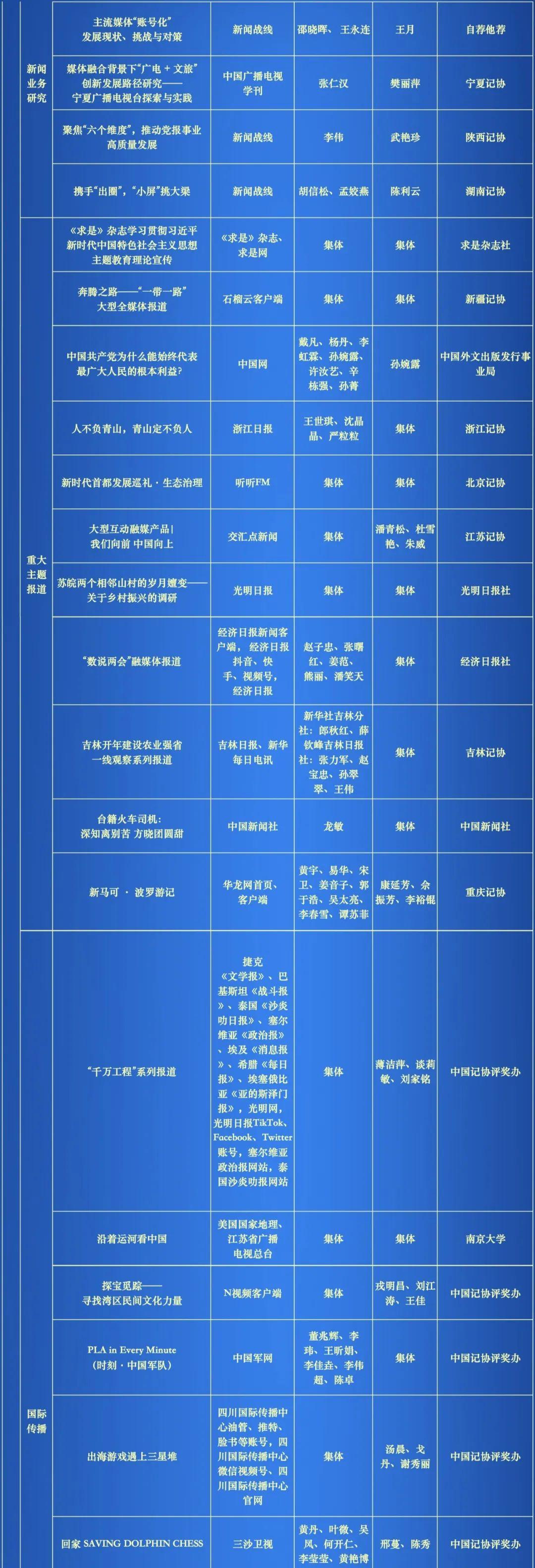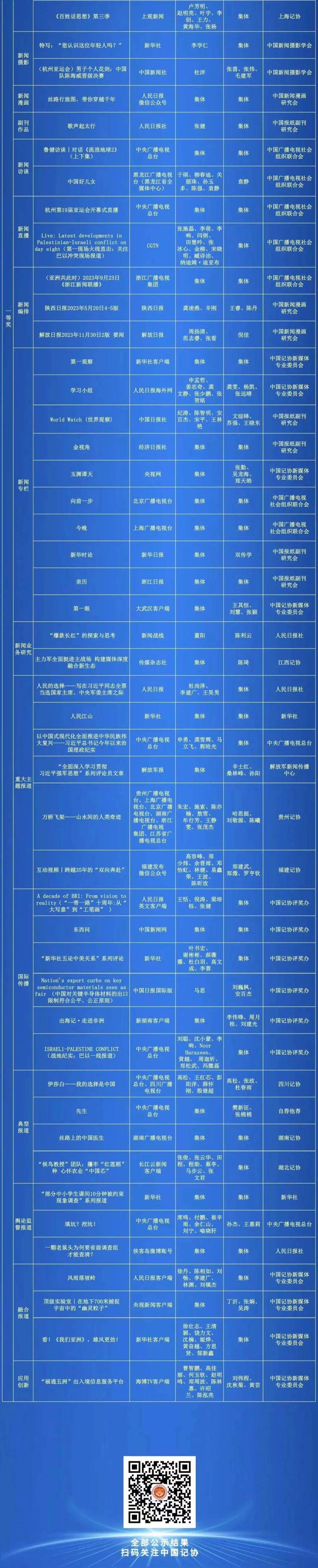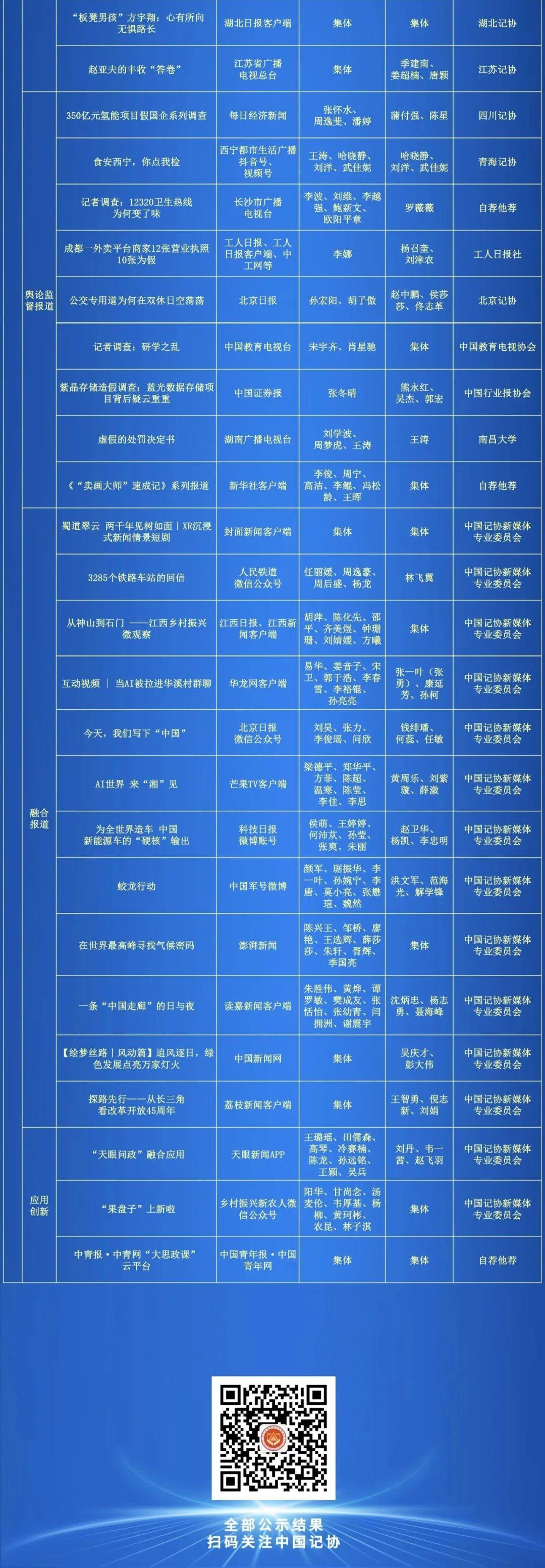 关于公示第34届中国新闻奖评选结果的公告 由中华全国新闻工作者协会(简称“中国记协”)主办的第34届中国新闻奖评选结果自今日起在中国记协微信公众号、中国记协网公示。本届拟获奖作品378件,其中特别奖4件、一等奖75件、二等奖111件、三等奖188件。 公示截止日期为2024年11月3日。在此期间,社会各界可通过电话、传真、信函或电子邮件等方式发表意见。中国记协评奖办公室将认真受理,按照《评选办法》规定对有关举报进行核查,并提出处理意见报评委会主任会议决定。 中国记协评奖办公室电话:010-61002846 邮箱:5826@vip.163.com 地址:北京市东城区珠市口东大街7号 邮编:100062 来源:中国记协微信(ID:zgjxacja) |