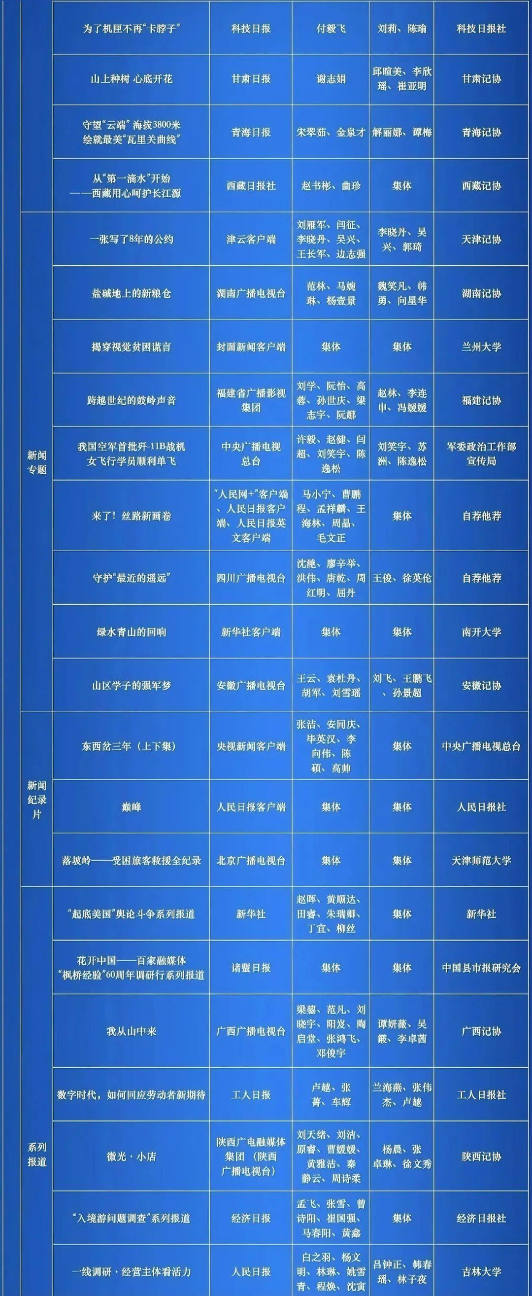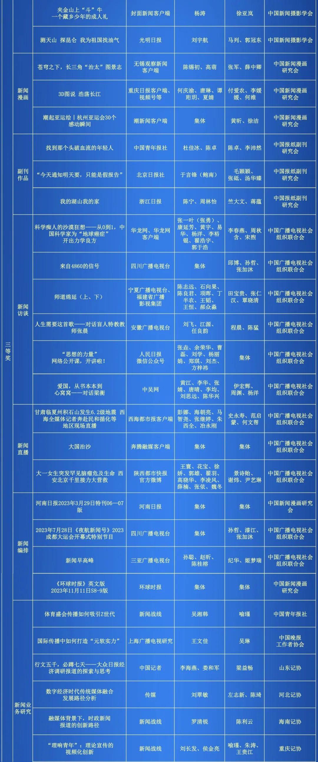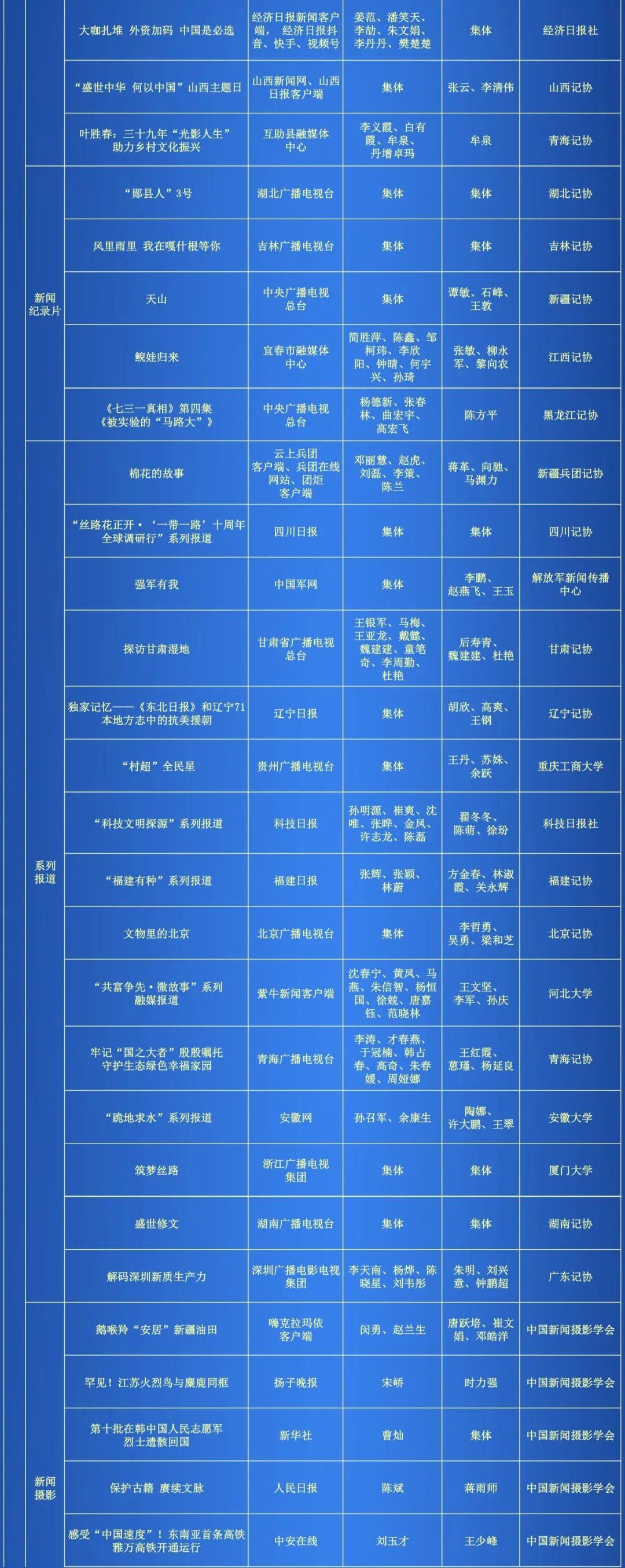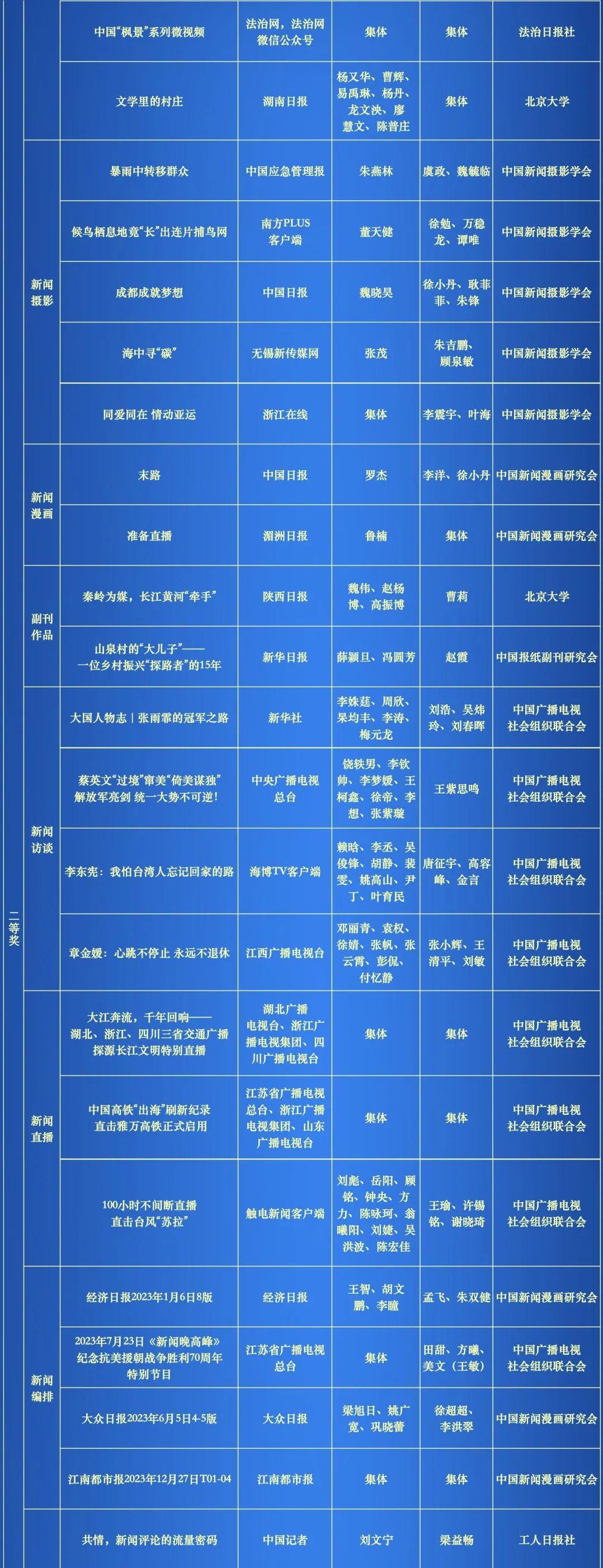 关于公示第34届中国新闻奖评选结果的公告 由中华全国新闻工作者协会(简称“中国记协”)主办的第34届中国新闻奖评选结果自今日起在中国记协微信公众号、中国记协网公示。本届拟获奖作品378件,其中特别奖4件、一等奖75件、二等奖111件、三等奖188件。 公示截止日期为2024年11月3日。在此期间,社会各界可通过电话、传真、信函或电子邮件等方式发表意见。中国记协评奖办公室将认真受理,按照《评选办法》规定对有关举报进行核查,并提出处理意见报评委会主任会议决定。 中国记协评奖办公室电话:010-61002846 邮箱:5826@vip.163.com 地址:北京市东城区珠市口东大街7号 邮编:100062 来源:中国记协微信(ID:zgjxacja) |