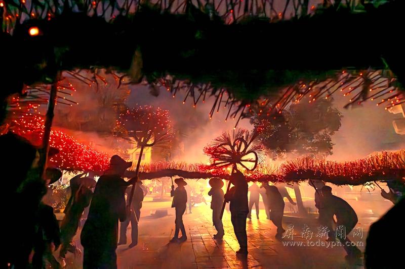 在锣鼓声中,一条由千支香火缀成的“火龙”在夜幕下翻腾起舞,火星闪动,气势恢宏。村民们高举龙身,沿村中古巷游行祈福,所过之处爆竹齐鸣、烟花齐绽。