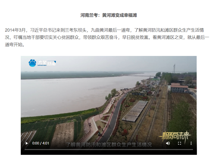 2019年9月,习近平总书记来到黄河国家地质公园临河广场,眺望黄河。总书记指出,要共同抓好大保护协同推进大治理,让黄河成为造福人民的幸福河。看黄河河南之变,就从黄河中下游分界线开始。