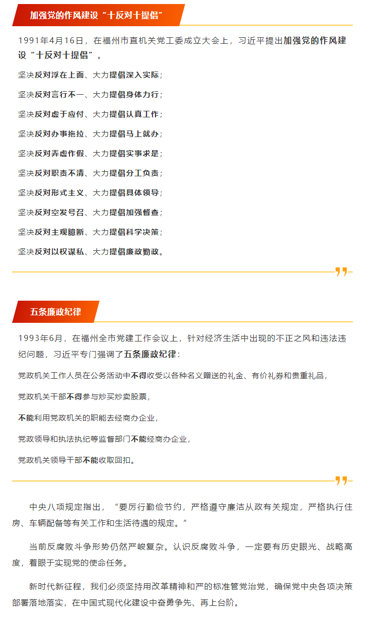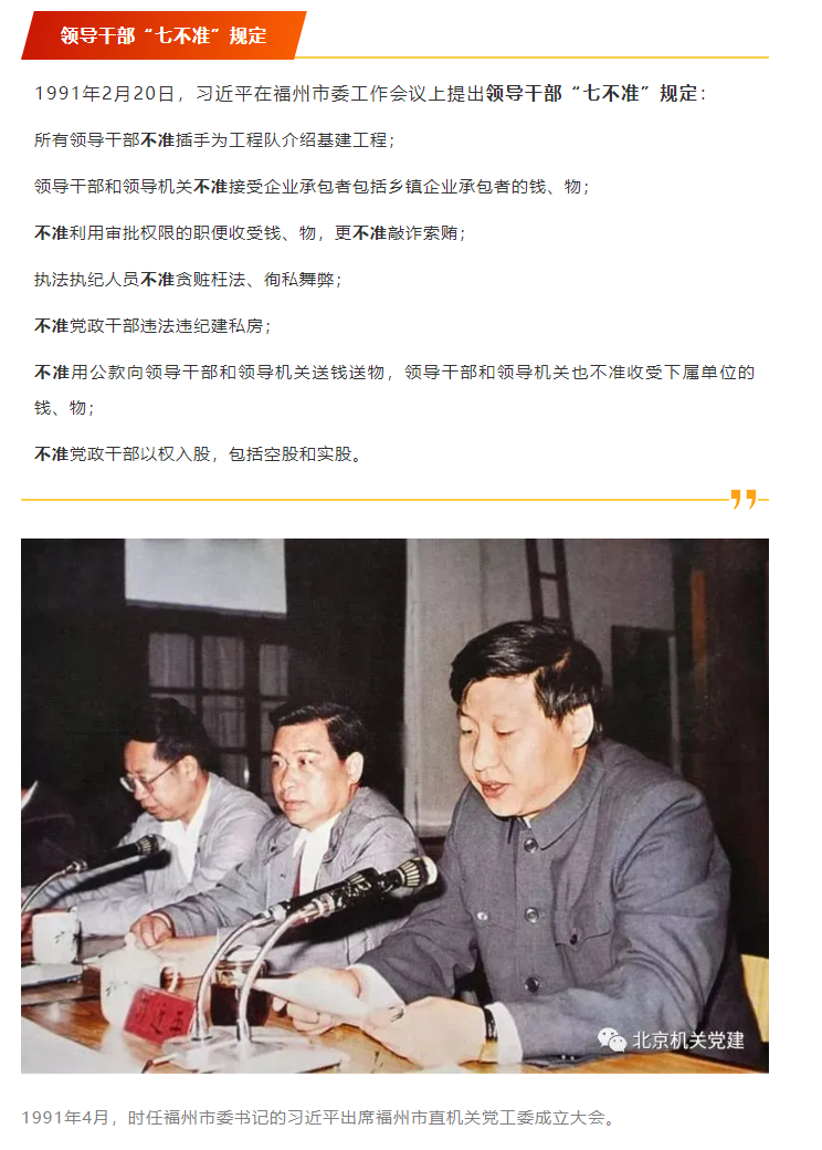 20世纪90年代,中国改革开放进入了新的历史阶段,社会主义市场经济蓬勃发展。但社会上也充斥着不和谐调声,一些领导干部认为纪委工作只会给改革开放的大好形势设障碍、搞干扰。 1991年,时任福州市委书记的习近平在省纪委机关刊物《福建纪检》第七期上发表《以铁的纪律为九十年代发展保驾护航》一文,他回答了为什么要加强党风廉政建设和反腐败斗争、怎样加强党风廉政建设和反腐败斗争的问题:党的纪律是保持党的队伍的纯洁性和战斗力,保证党的事业取得胜利的基本条件。必须依靠铁的纪律,来统一全党的思想和行动;必须依靠铁的纪律,推进改革开放的健康发展;必须依靠铁的纪律,保证十年规划和“八五”计划的顺利实施。 那时,全国各地兴起了经商办企业、炒股的热潮,福州市委办公厅有的同志到外地参观学习,回来后激动不已,也建议创办印刷厂、冰棒厂之类的企业,集资筹办创收。 习近平知道后,与时任福州市委常委、秘书长林文彬碰了头。 “你要注意,党政机关绝对不能经商办企业,鱼与熊掌不可兼得,想发财就不能当干部,当干部就不要想发财。”习近平语重心长。 当时,各地党员干部当中不少人热衷炒股。习近平不断给大家敲响警钟:“要守好规矩、专心做事,千万不要贪图那些蝇头小利。” 一些企业想要把股票作为干部福利送给大家,习近平断然拒绝:“我们用不着这样做,干部的福利问题有组织来关心,不用这些老板‘破费’。” 边反边改,边反边建,针对出现的新问题,制度建设循序渐进。