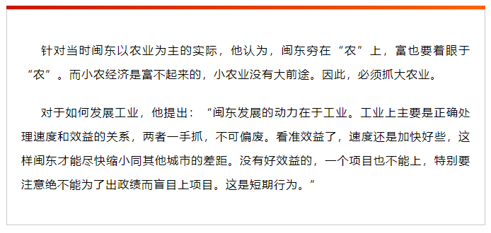 1989年1月,习近平在屏南县调研时走访农家。 经过调研,习近平初步确立了闽东的发展思路:当时,闽东的老百姓连温饱都成问题,区情、区力根本不具备跨越式发展、大规模开发条件,不能一味地谋求超常规发展,而应当把解决吃饭穿衣住房为内容的“摆脱贫困”作为工作主线,为下一步实现跨越式发展打基础、创条件。 在来宁德工作后的第一篇调查报告《弱鸟如何先飞——闽东九县调查随感》中,他用“弱鸟”来形容贫困的闽东,用“弱鸟先飞”来强调贫困的闽东要来一个思想解放、观念更新,要有“先飞”的意识,要有“飞洋过海的艺术”。这样,就可达到“弱鸟可望先飞,至贫可能先富”。 在深入调研、思考的基础上,习近平先后撰写了《对闽东经济发展的思考》《正确处理闽东经济发展的六个关系》等文章,进一步理清了闽东经济发展的思路——“关键在于农业、工业两个轮子怎么转”。