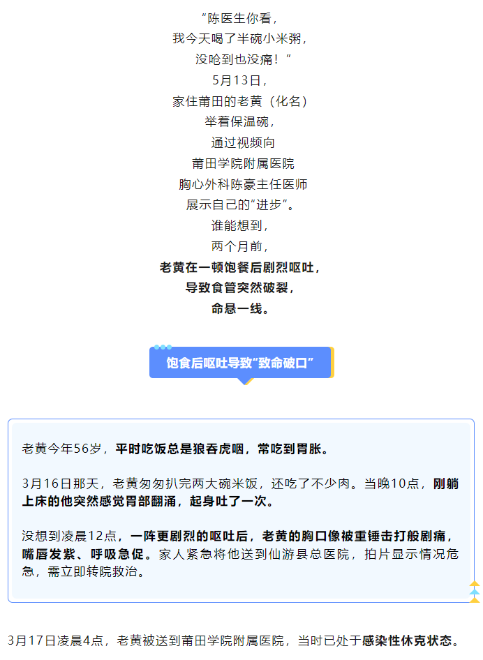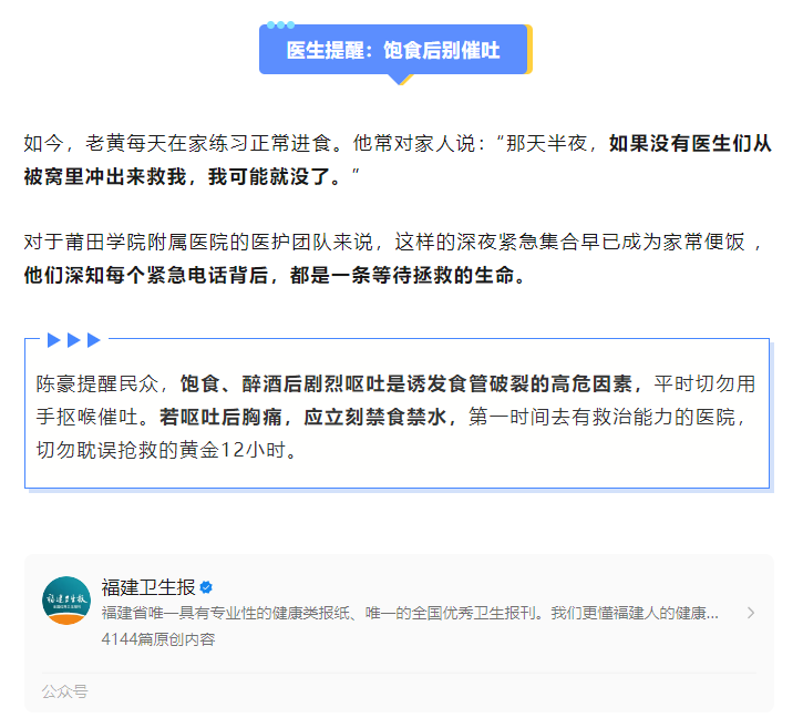 吃饱后千万别做这事!福建男子突然食管“炸了”,命悬一线!医生紧急提醒→